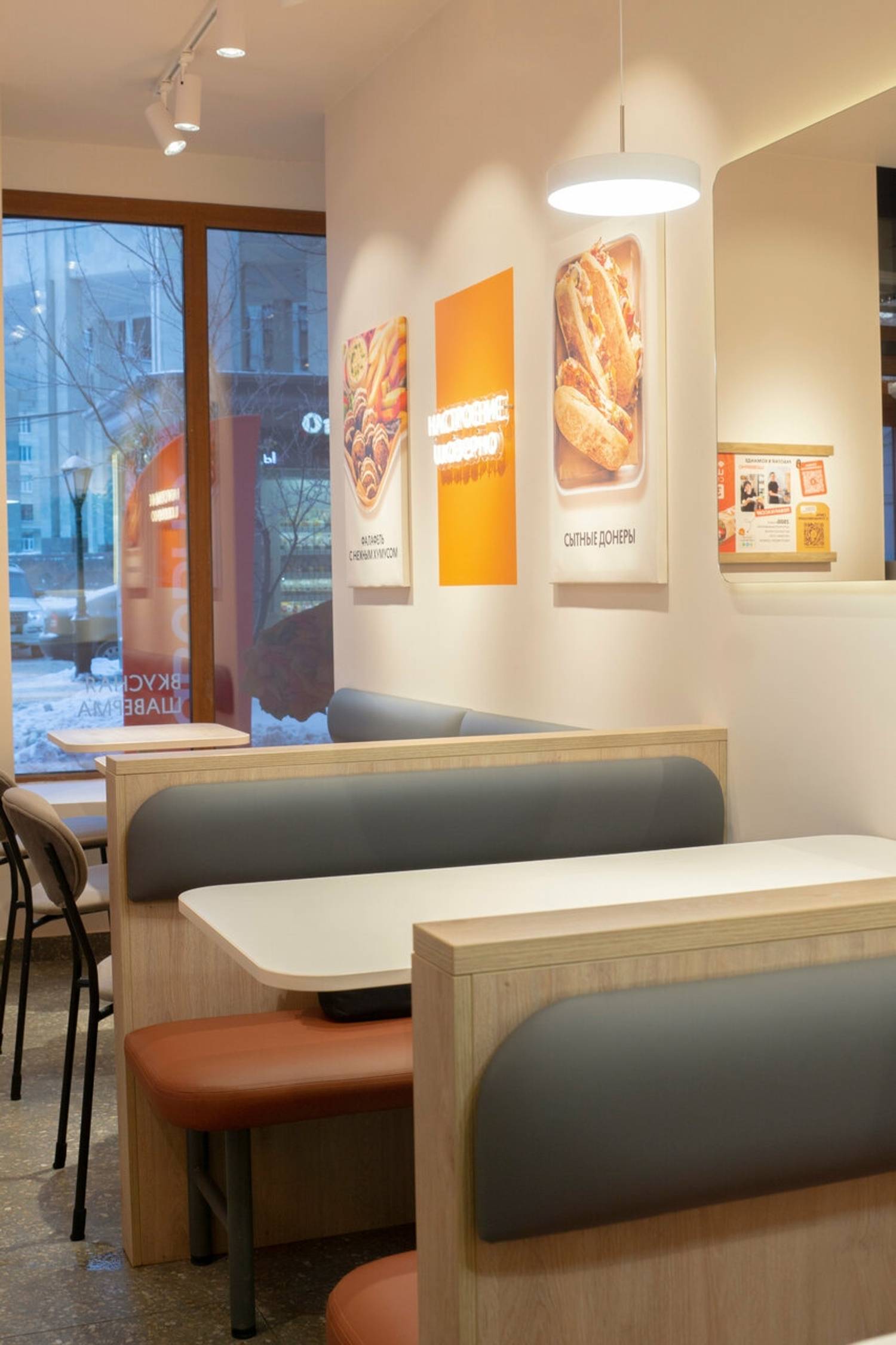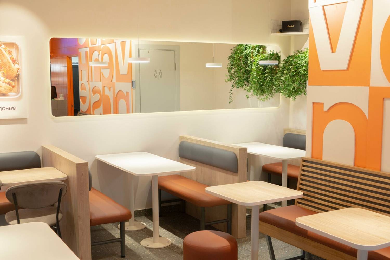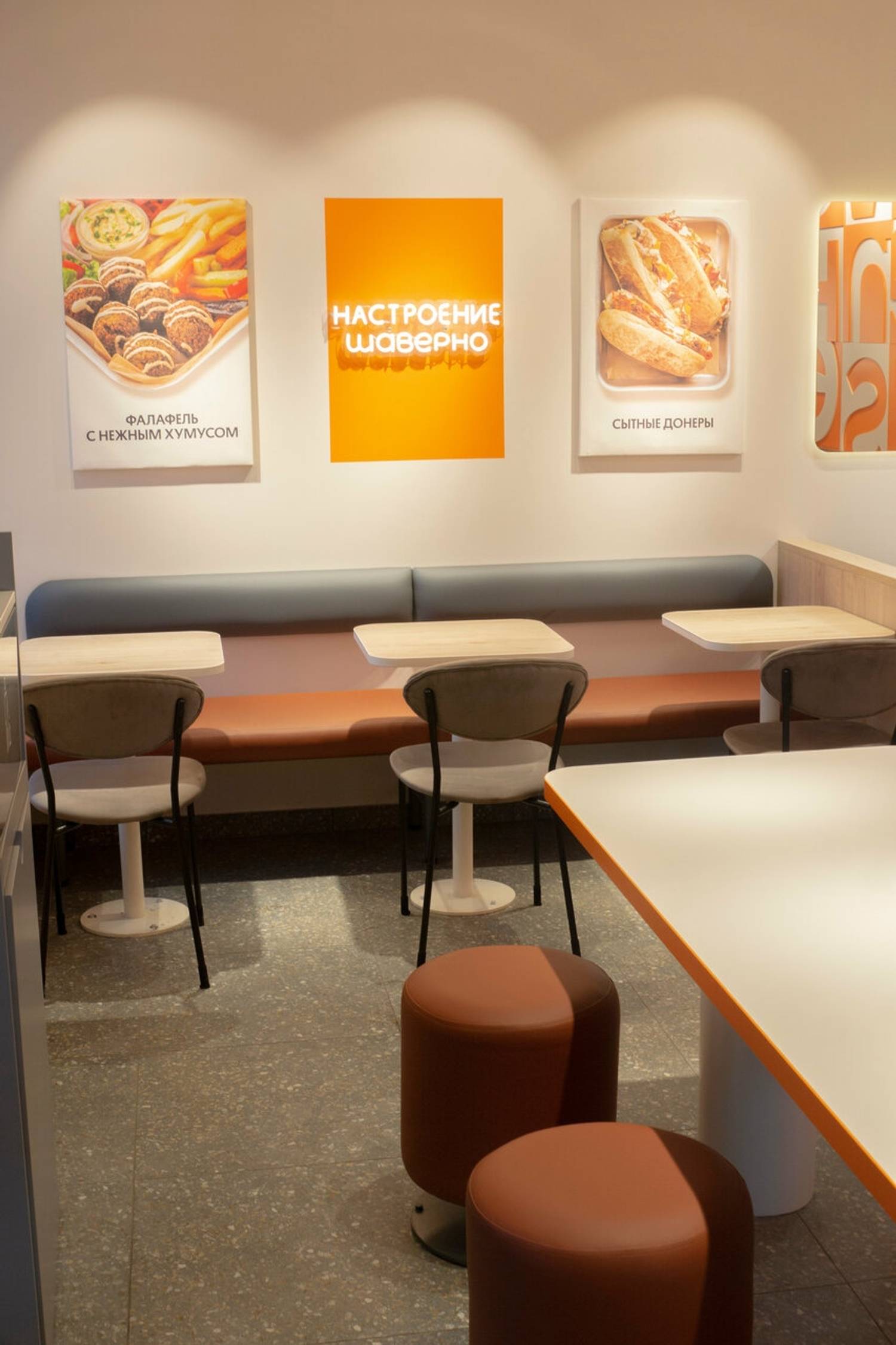 Атмосфера. Светлое помещение в бело-оранжевых тонах, с живыми растениями на стенах и мягкой мебелью обтекаемых форм создает легкую и непринужденную обстановку. А яркие надписи на стенах и открытая кухня, где готовят шаверму, добавляют пространству динамики.