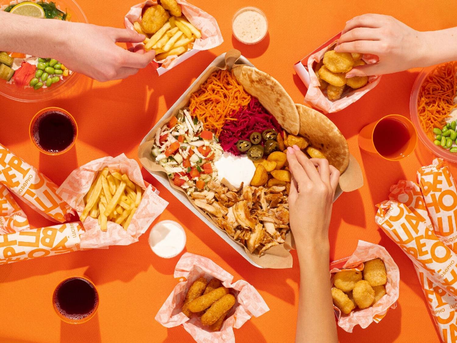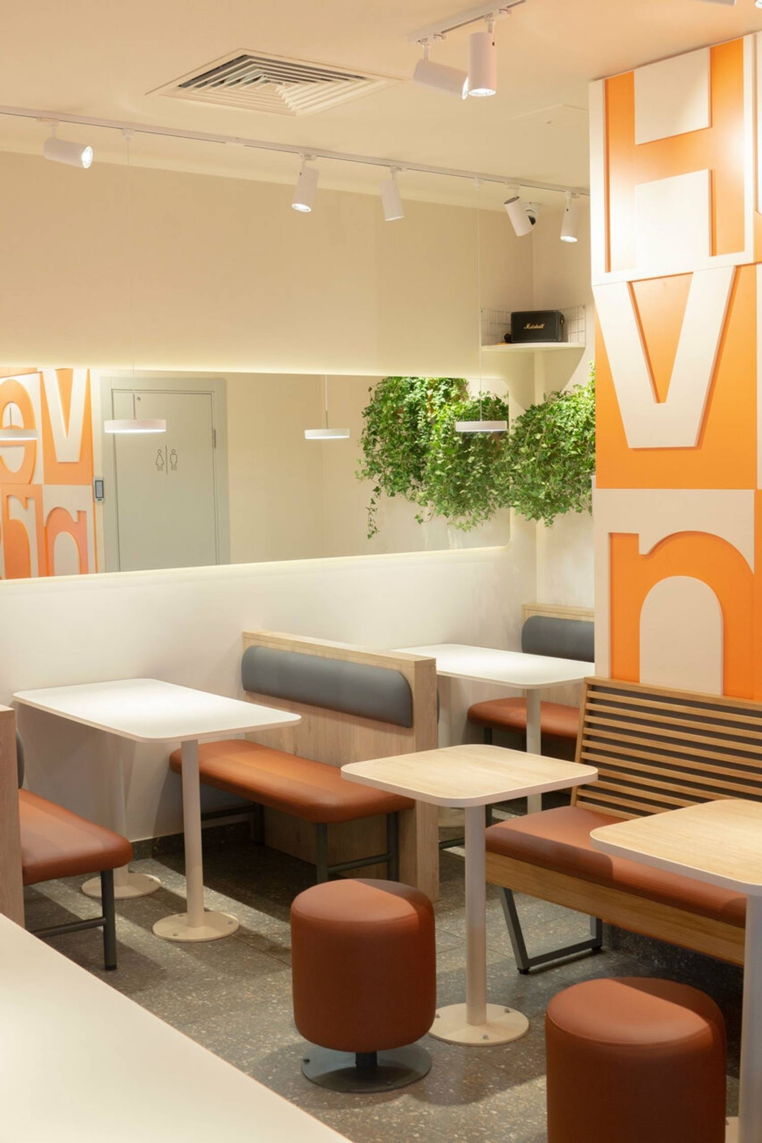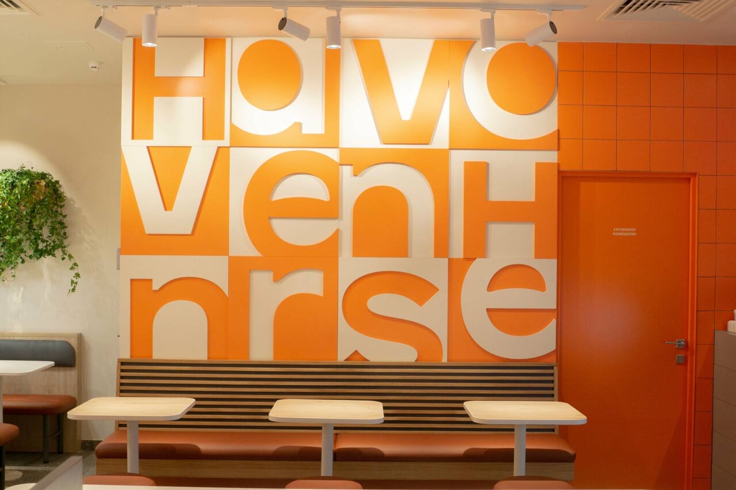 Атмосфера. Светлое помещение в бело-оранжевых тонах, с живыми растениями на стенах и мягкой мебелью обтекаемых форм создает легкую и непринужденную обстановку. А яркие надписи на стенах и открытая кухня, где готовят шаверму, добавляют пространству динамики.
