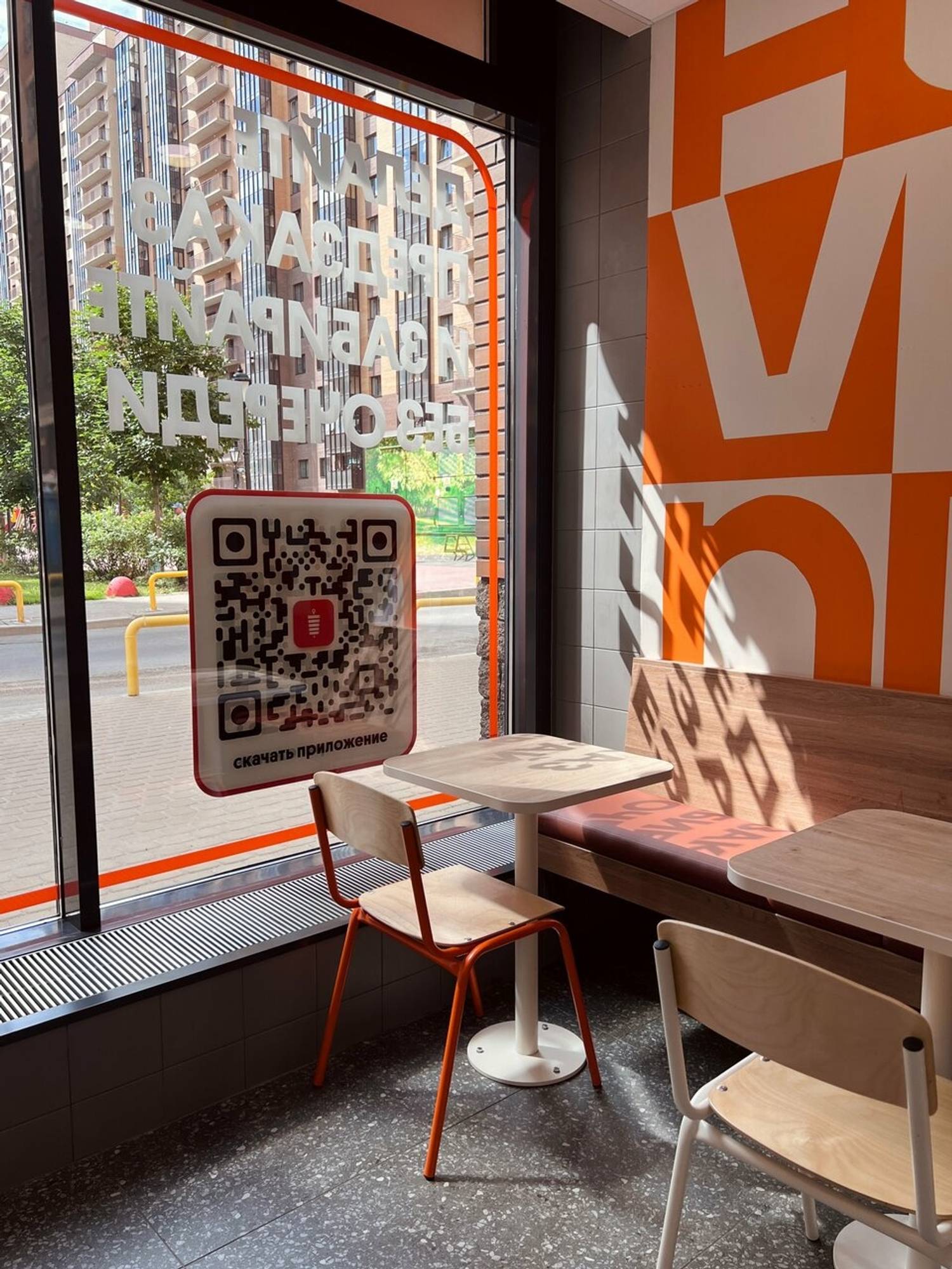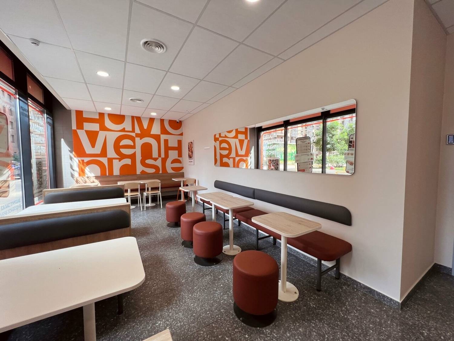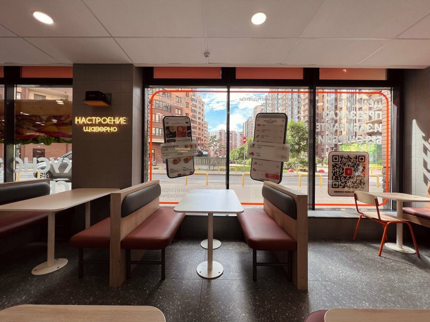 Атмосфера. Просторное помещение с большими панорамными окнами наполнено светом. В интерьере доминируют фирменные оранжево-белые тона, сделаны мягкие сидения и продумана разнообразная рассадка: от уединенных столиков для одного до удобных диванчиков для компании друзей.