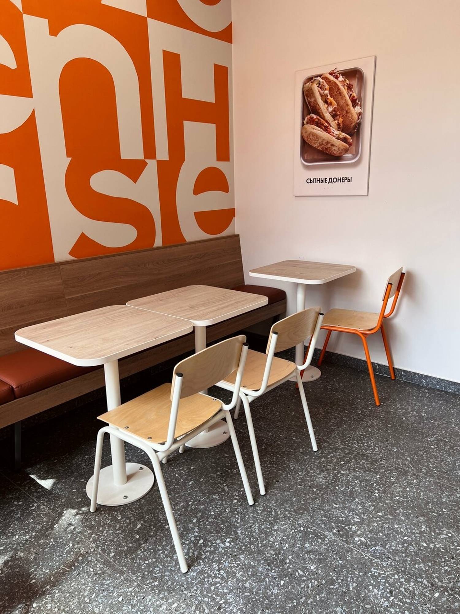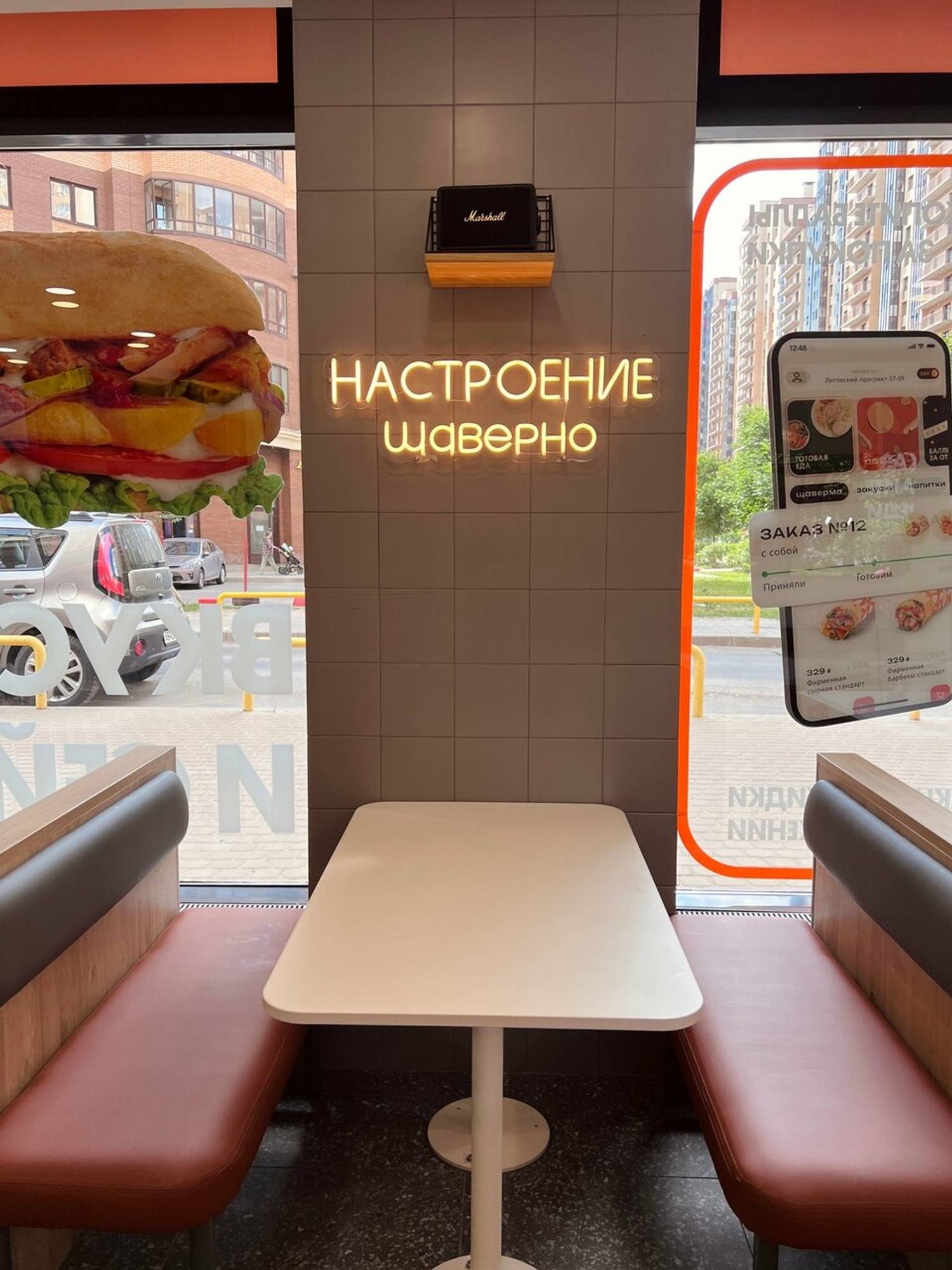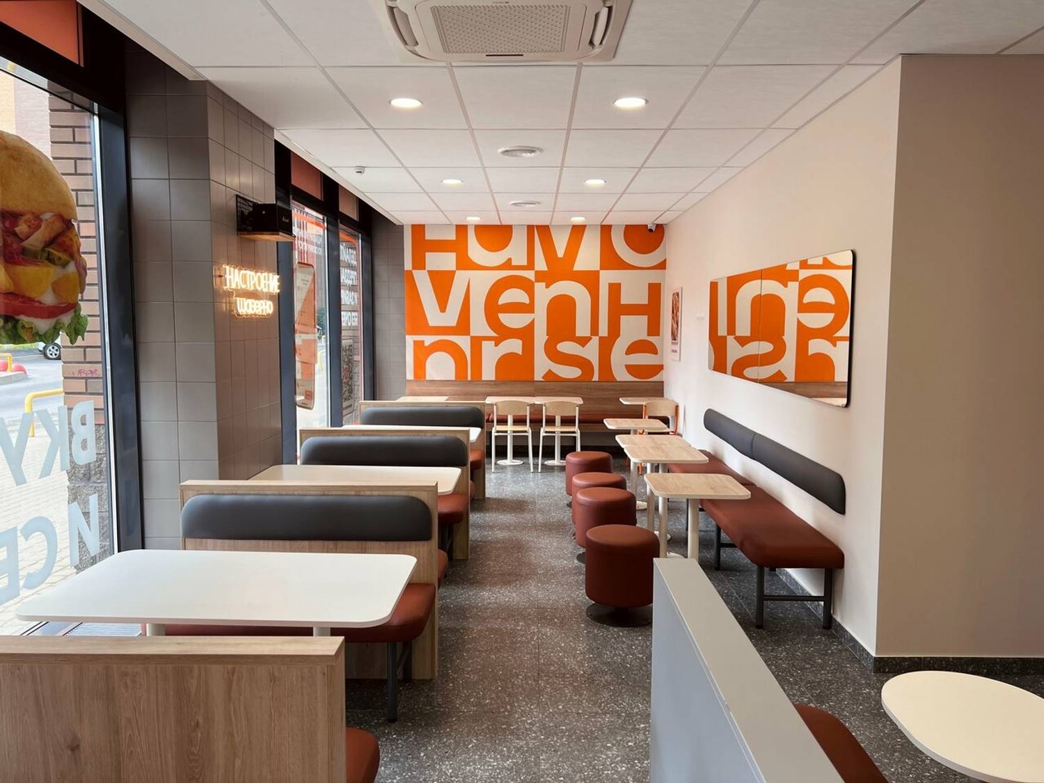 Атмосфера. Просторное помещение с большими панорамными окнами наполнено светом. В интерьере доминируют фирменные оранжево-белые тона, сделаны мягкие сидения и продумана разнообразная рассадка: от уединенных столиков для одного до удобных диванчиков для компании друзей.