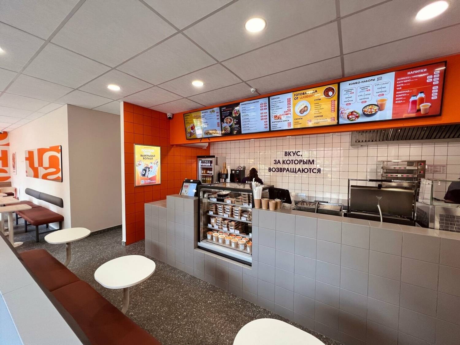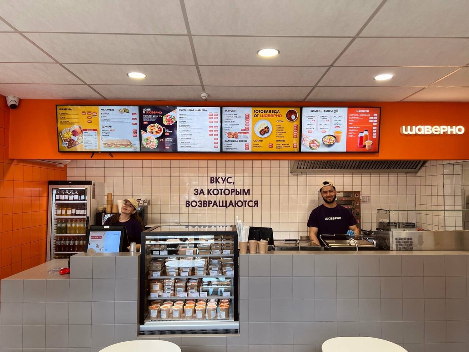 Еда и напитки. Гости могут выбрать свою идеальную шаверму из 19 вариантов или взять сытный комбо-обед с шавермой, картофелем и напитком. В меню также представлены донеры, салаты и горячие блюда: например, плов с курицей или паста карбонара.