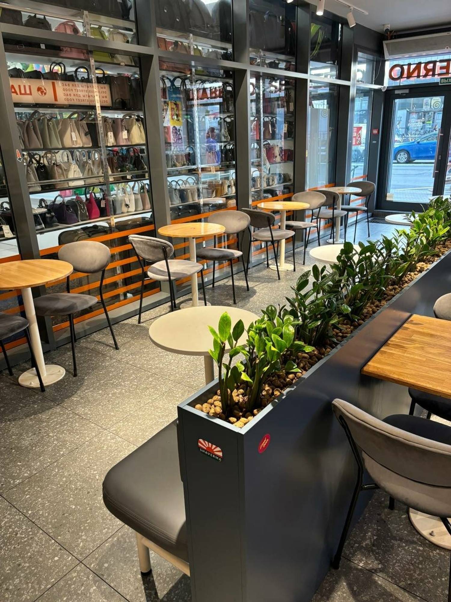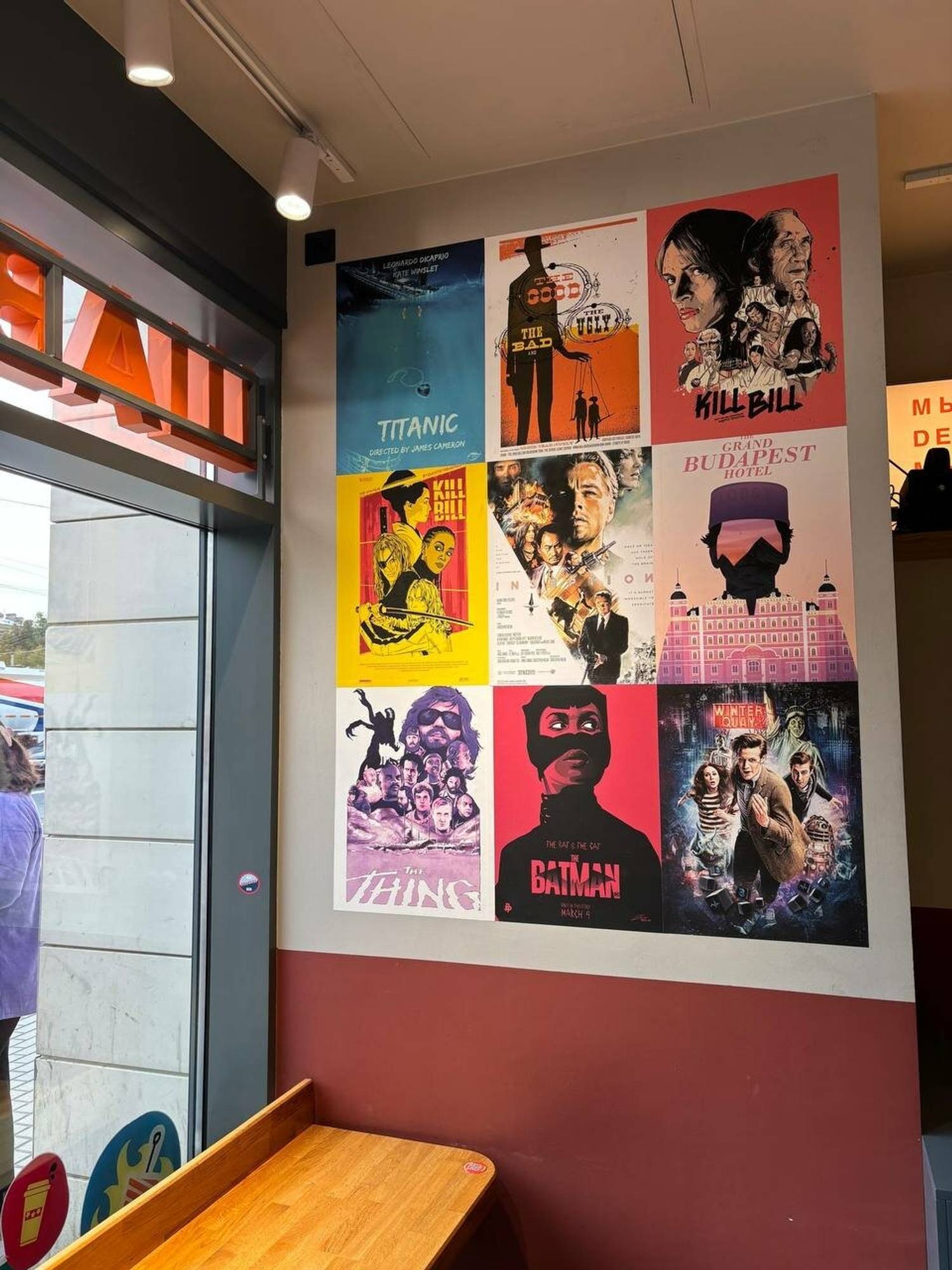 Атмосфера. Небольшое пространство с яркими плакатами и мини-столиками добавляет компактной точке динамики и стиля. Здесь предусмотрен холодильник с готовыми блюдами, что очень удобно для формата «взял и ушел» и для покупки еды по дороге на работу или домой.