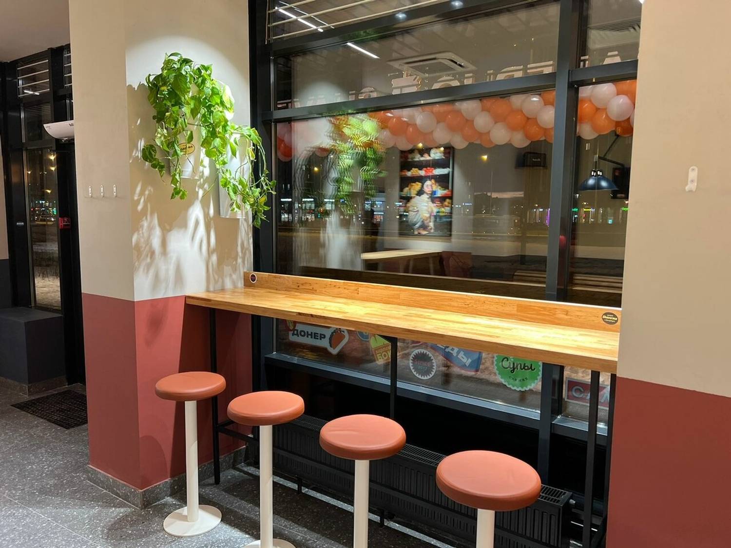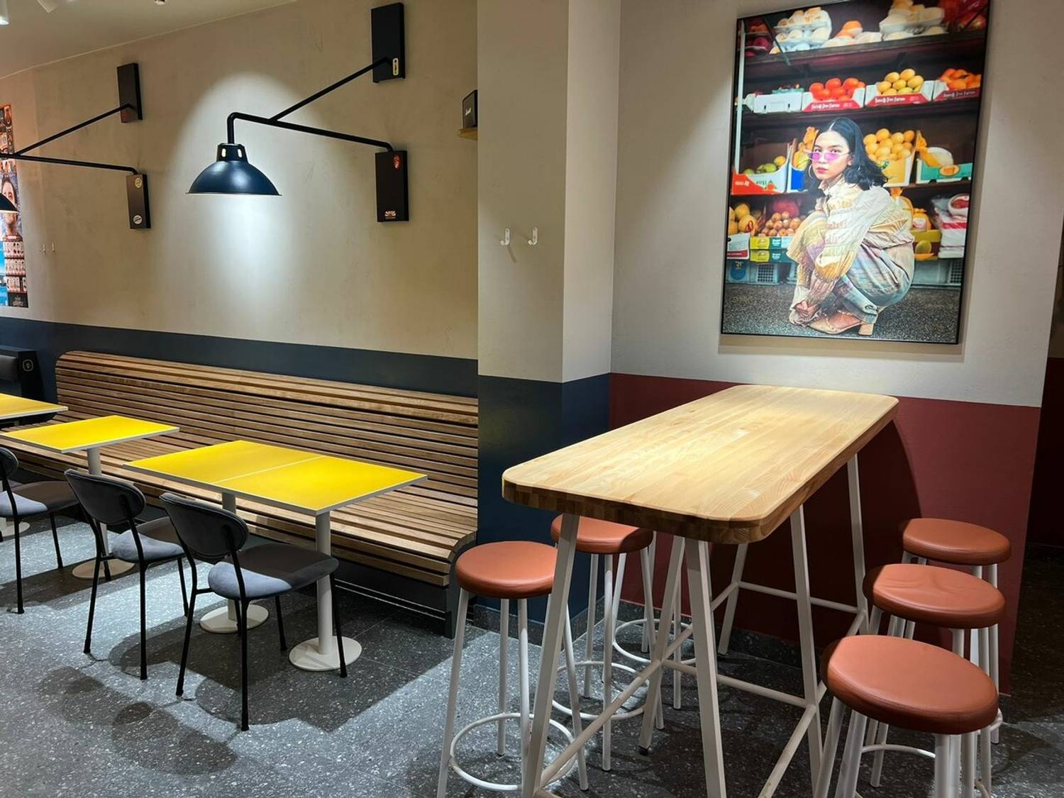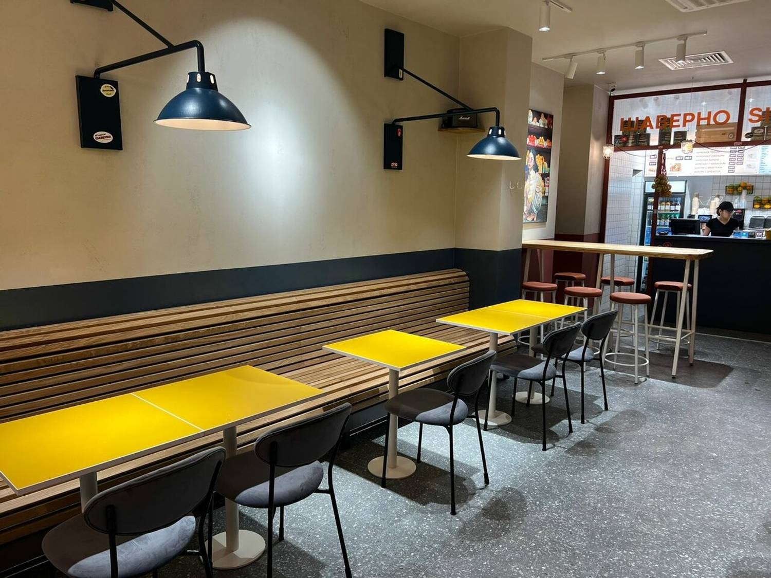 Атмосфера. Здесь создано яркое пространство с желтыми столами, графичными плакатами и комбинированной рассадкой: от уютных диванов до практичных барных стульев. Светлое оформление создает чистую и динамичную атмосферу, которая комфортна и для быстрого перекуса, и для долгих посиделок.