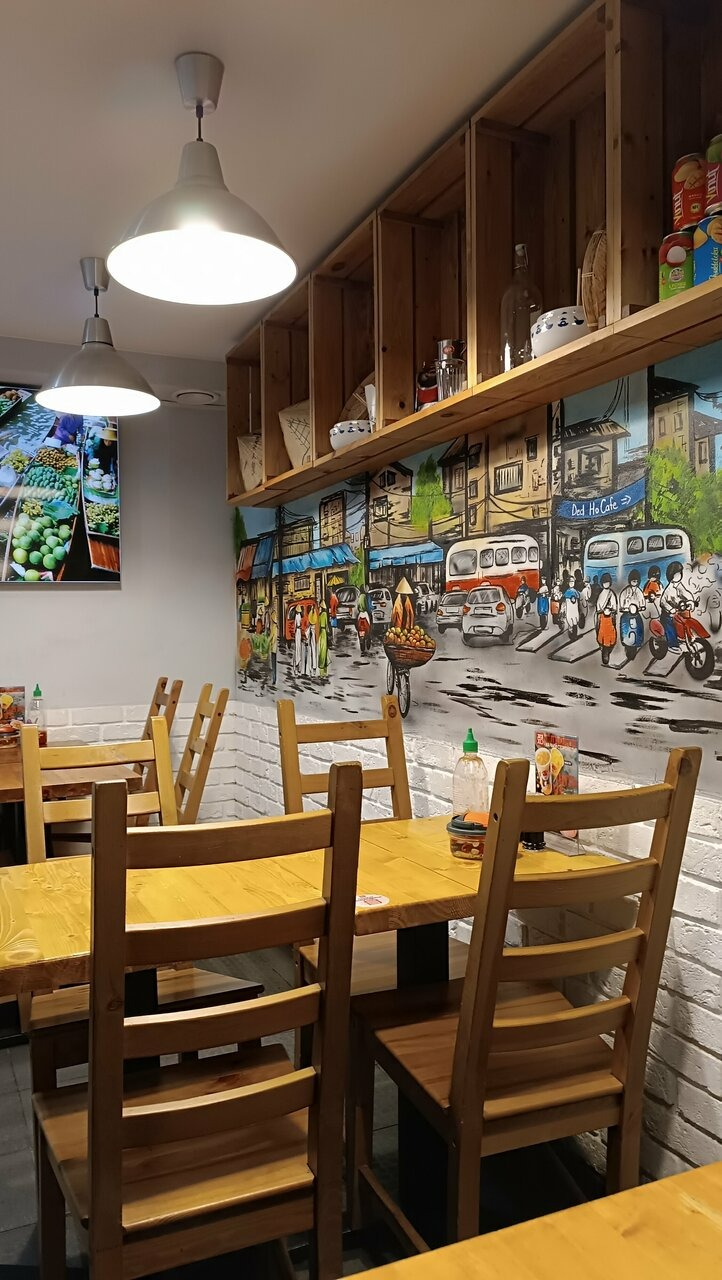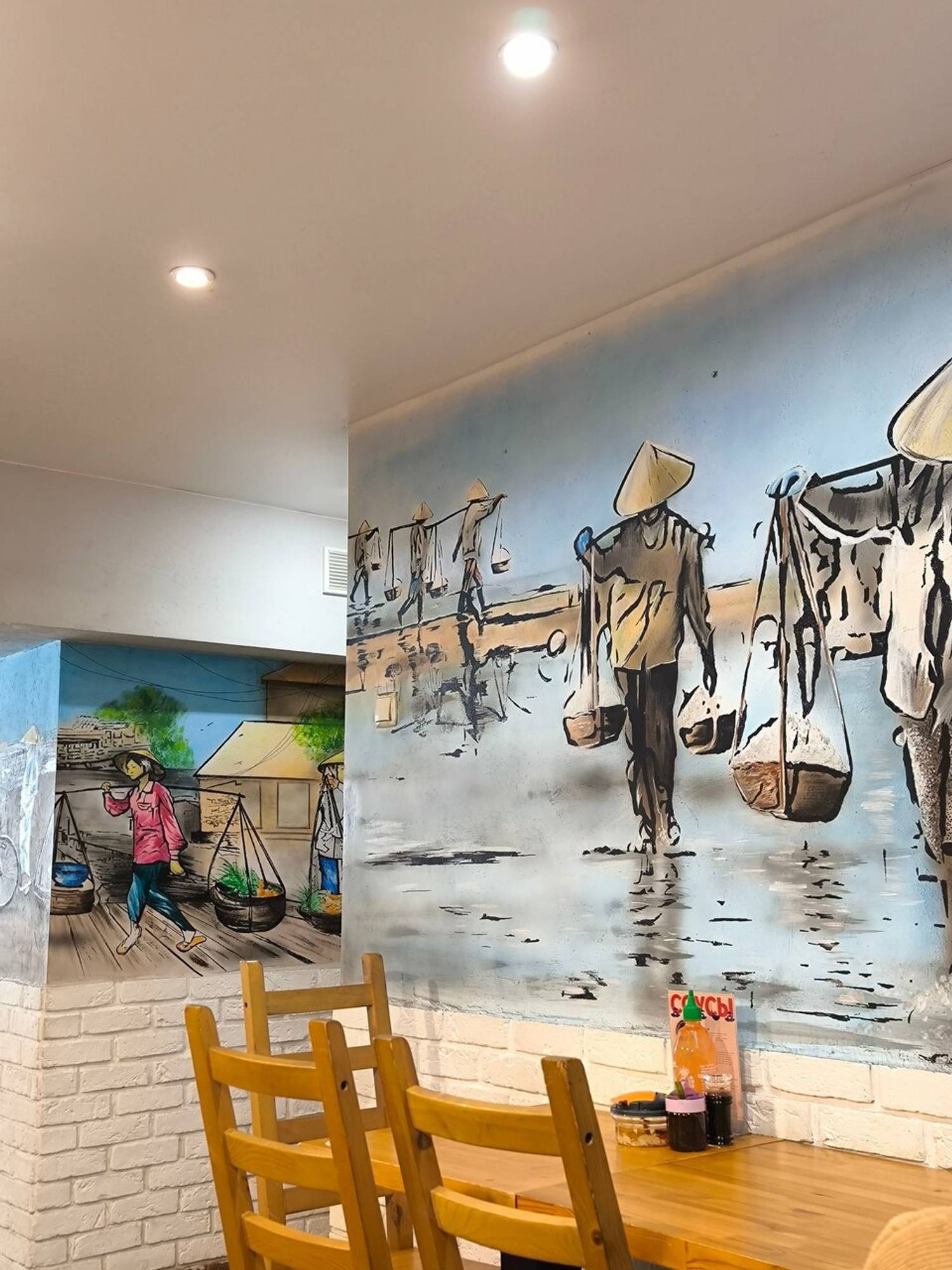 Атмосфера. Белые кирпичные стены служат фоном для ярких росписей, на которых изображены сцены из местной жизни — от людей в традиционных шляпах нон и лодок на реке до городской суеты с автобусами, мопедами и велосипедами. Кстати, азиатские шляпы можно даже примерить.