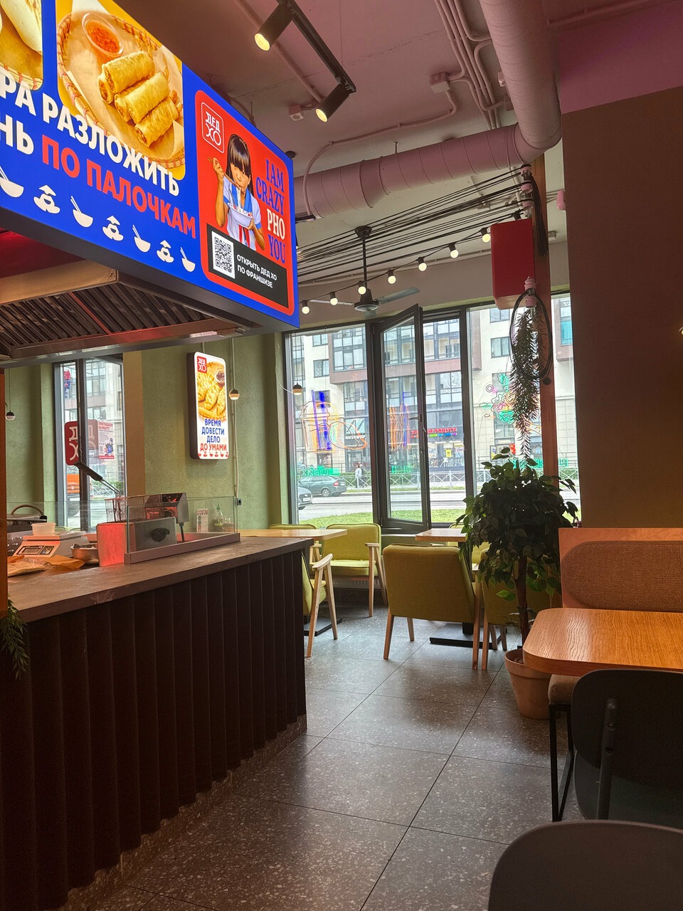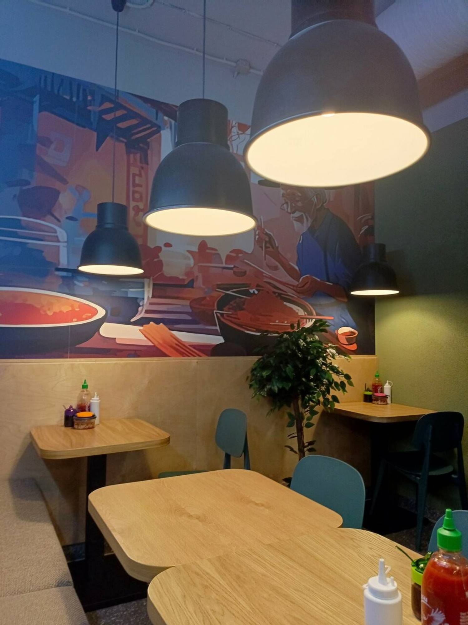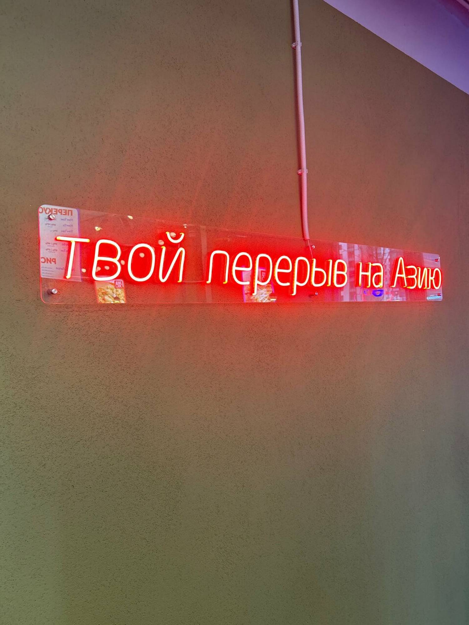 Атмосфера. Интерьер сочетает урбан-стиль с азиатскими мотивами: яркая неоновая вывеска с надписью «Твой перерыв на Азию», стены украшены картинами с изображениями азиатов в традиционных конических шляпах нон.