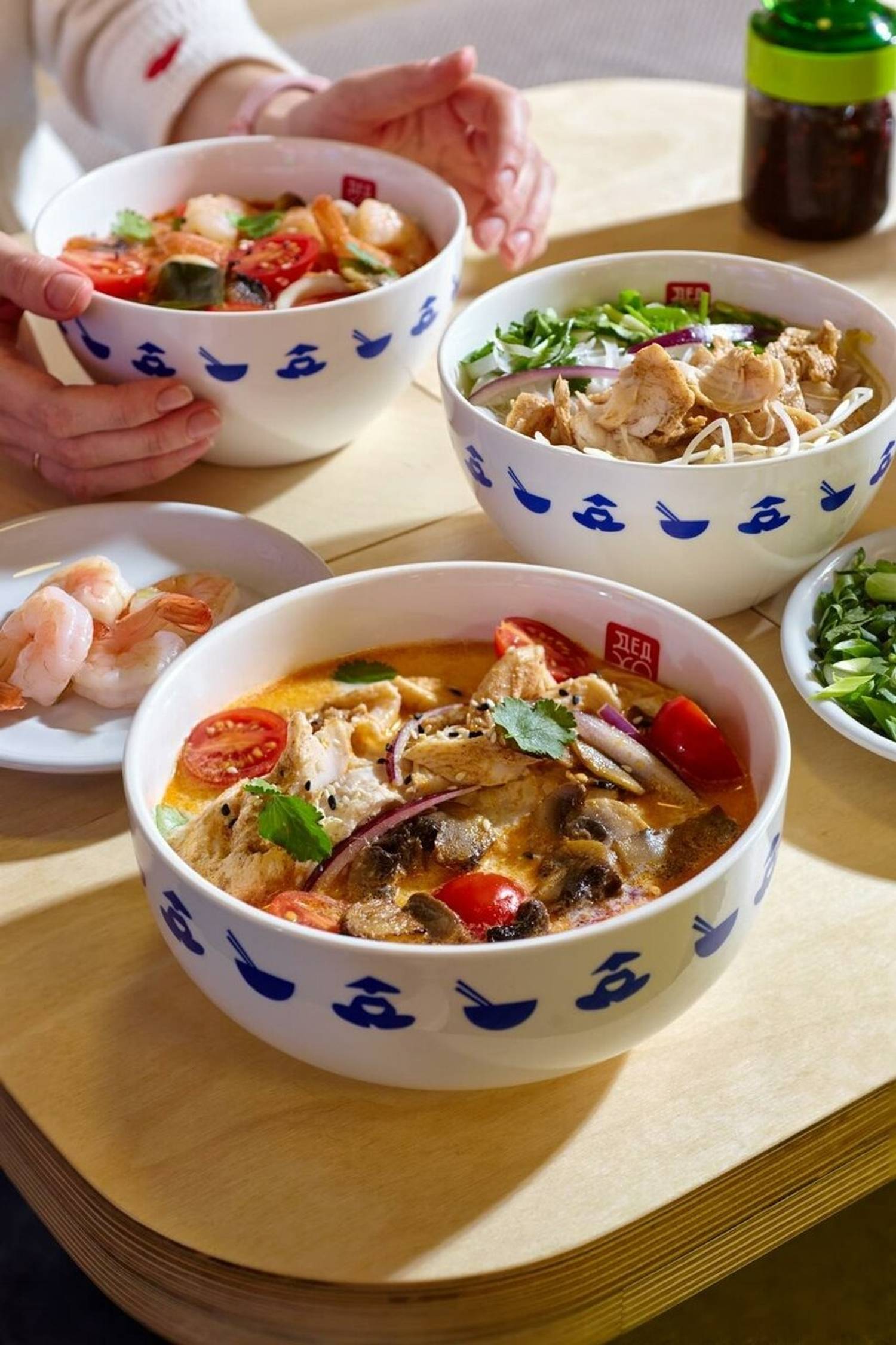 Еда и напитки. В меню — вьетнамская классика: суп фо га, вок с лапшой, курицей и тофу, шаверма с курицей в лаваше. На закуску берут креветки и кальмары в кляре, рулетики нэм том. Из напитков здесь есть бабл ти тропический микс, манго шейк, лимонад и морс.