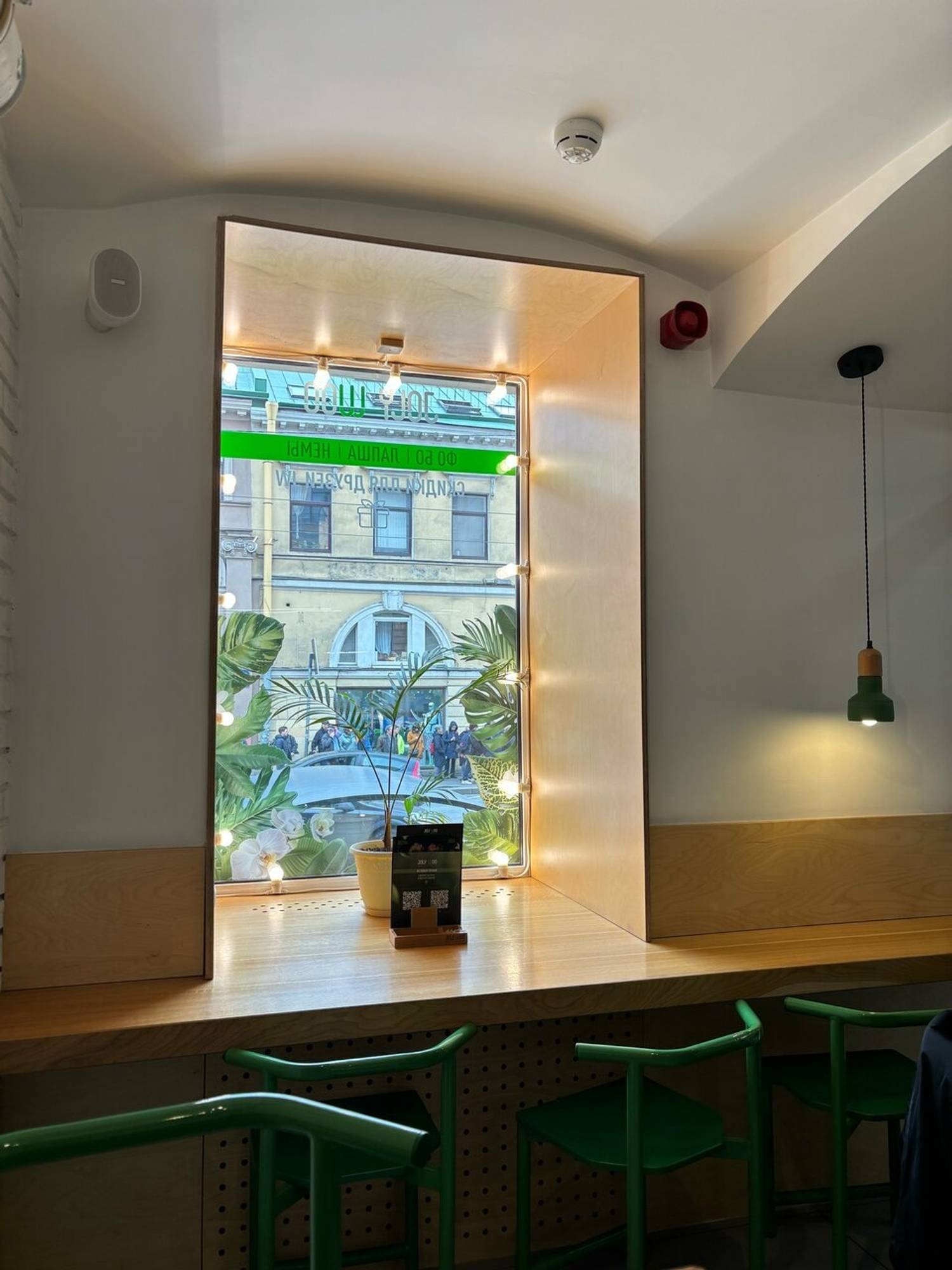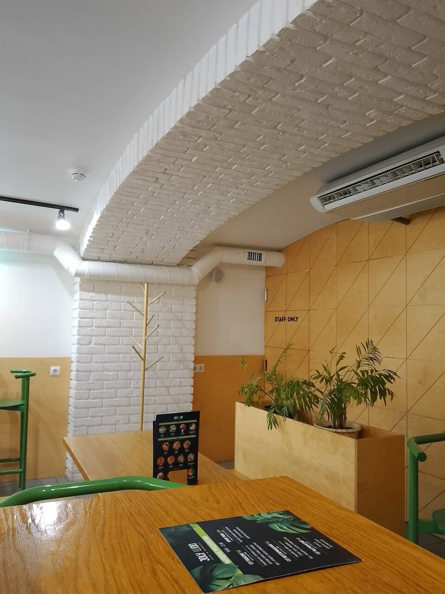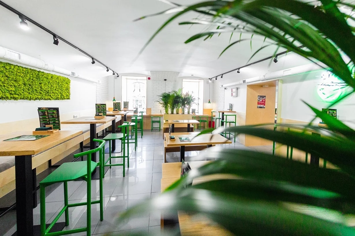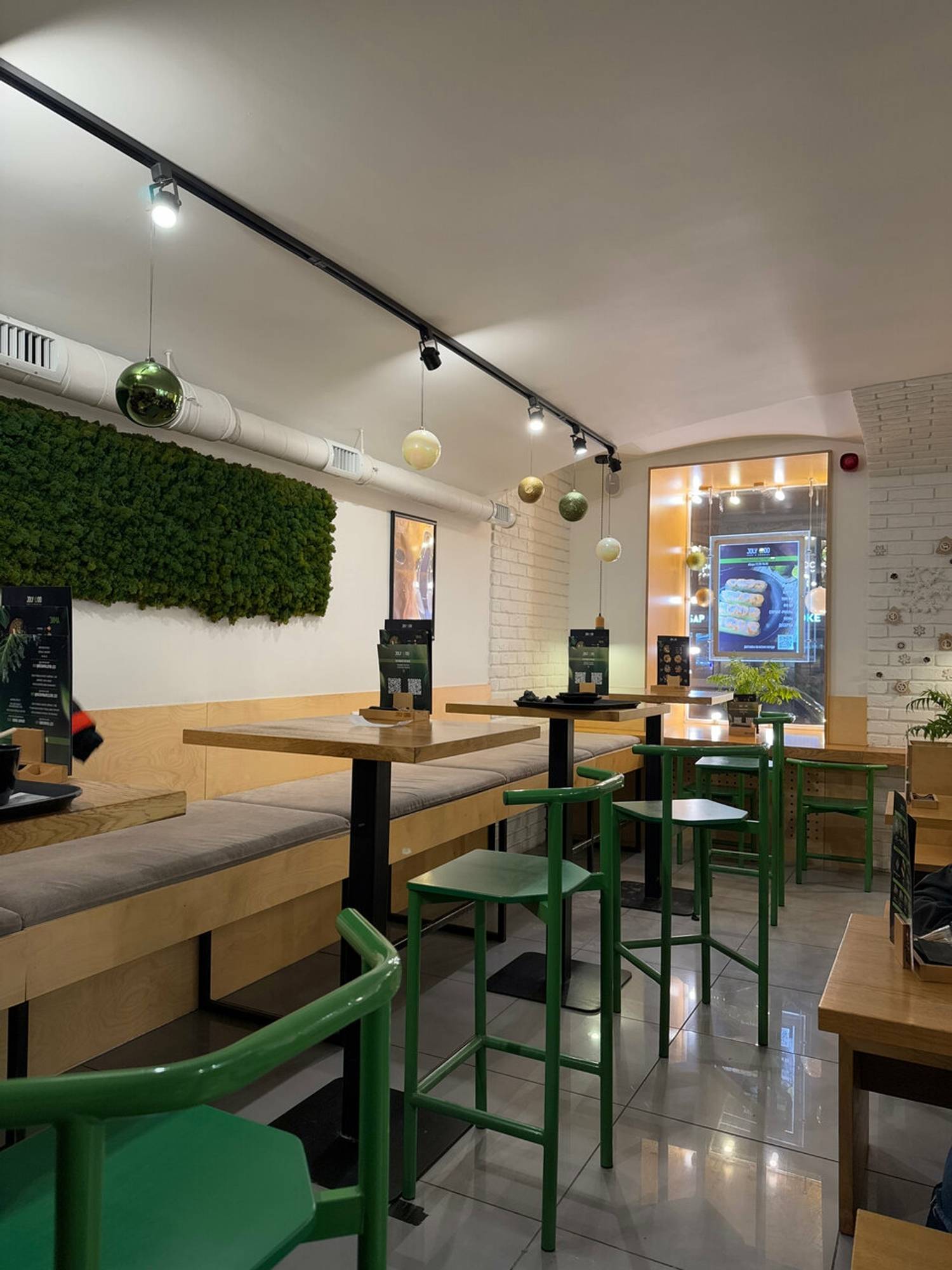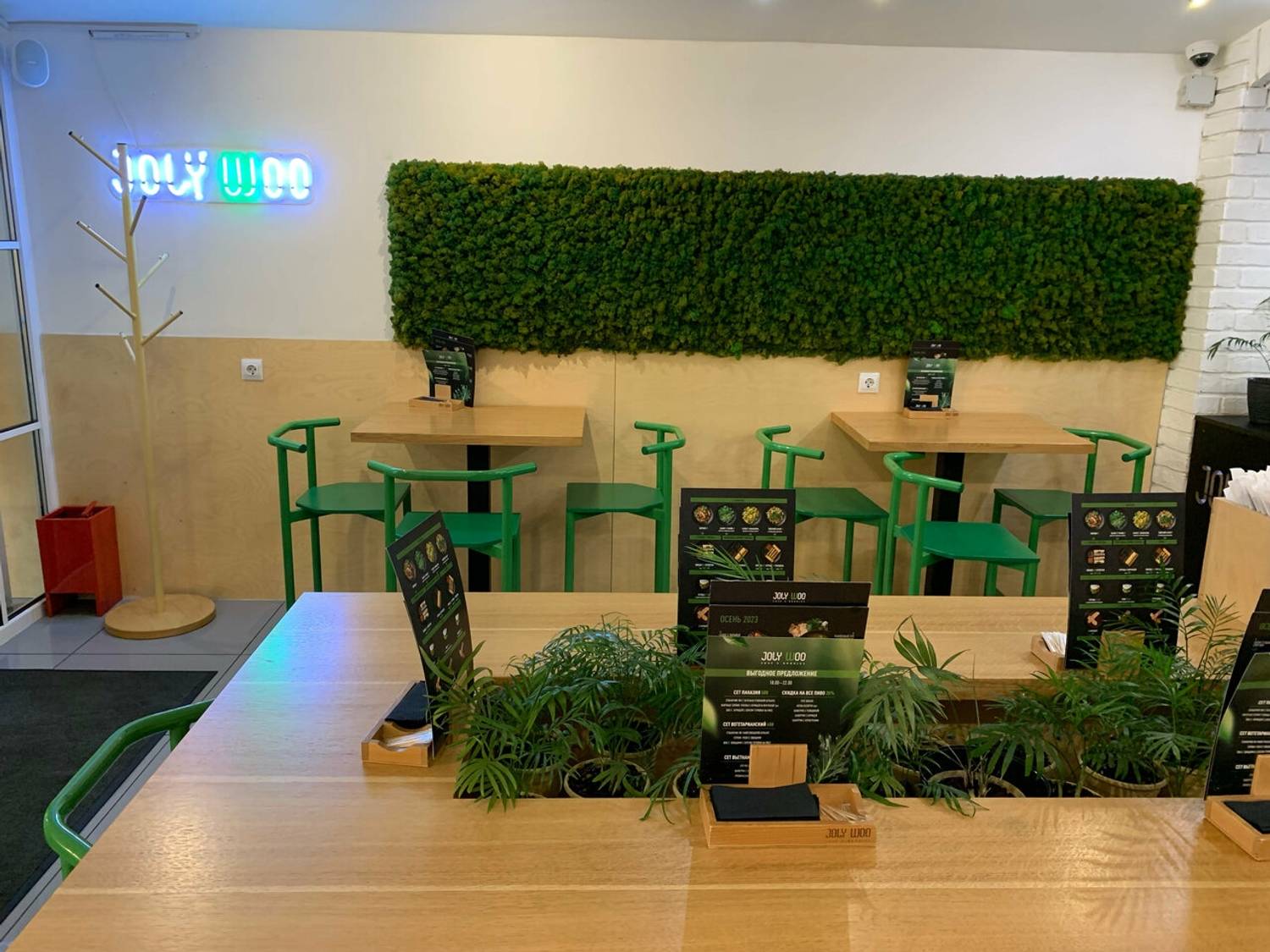Атмосфера. Пространство оформлено в эко-стиле: натуральные материалы, светлые тона и живые растения создают ощущение свежести и легкости. Яркие акценты и открытая кухня, где воки шипят на огне, навевают мысли об азиатских улицах и наполняют зал ароматом пряностей.