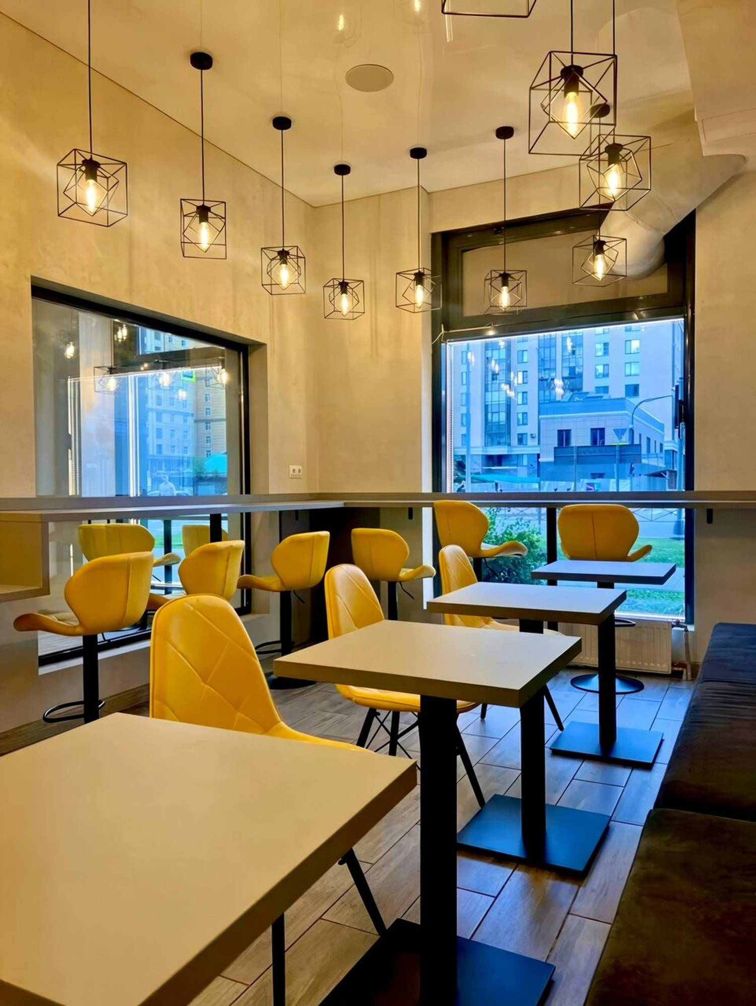 Атмосфера. Яркая желтая стойка и стулья с названием ресторана сразу задает позитивный тон. Стены украшены надписями на разных языках, за высокими столы у панорамного окна, можно наблюдать за уличной жизнью.