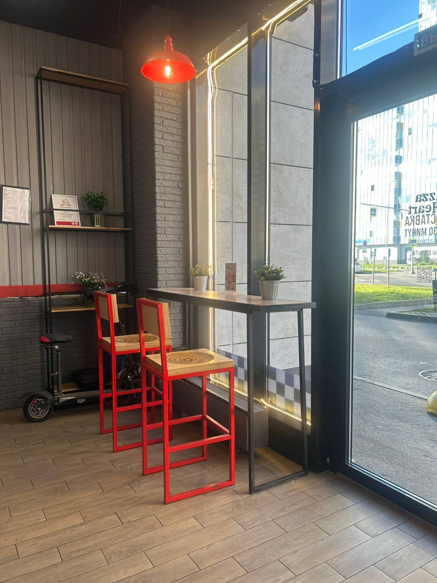 Атмосфера. Простой современный дизайн с деревянными стулья на металлических ножках и высокими столами у панорамного окна. На стене повесили неоновую вывеску названия заведения с сердечком.