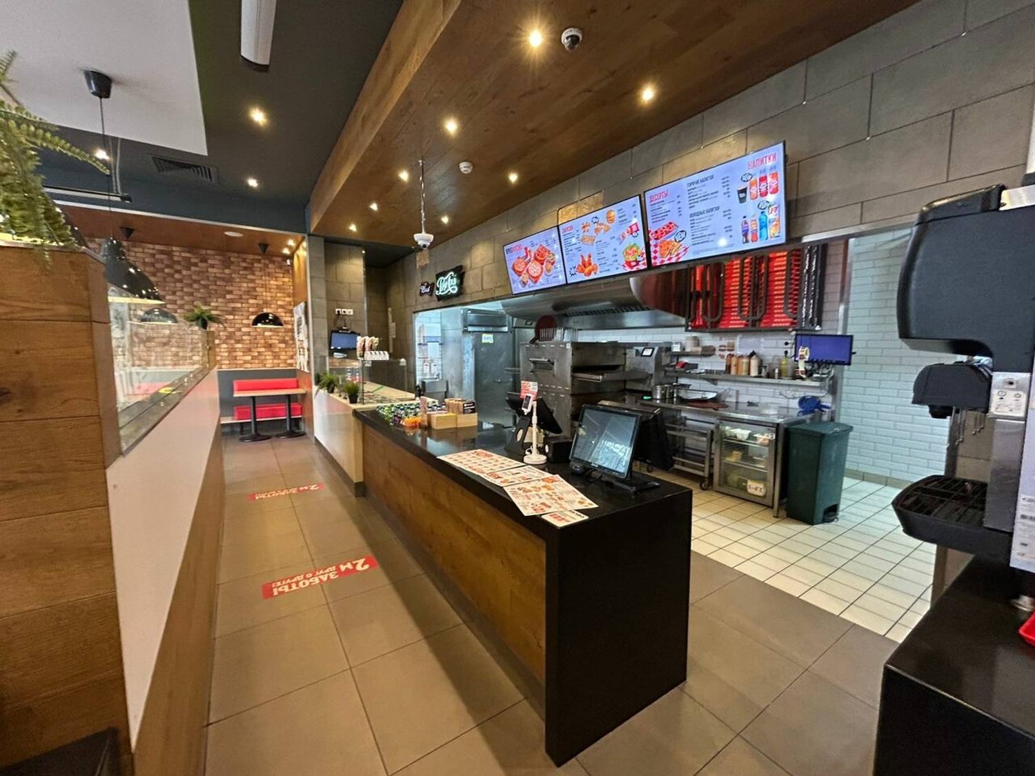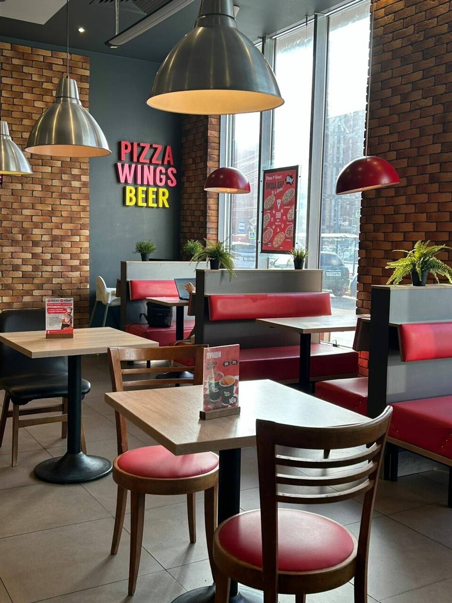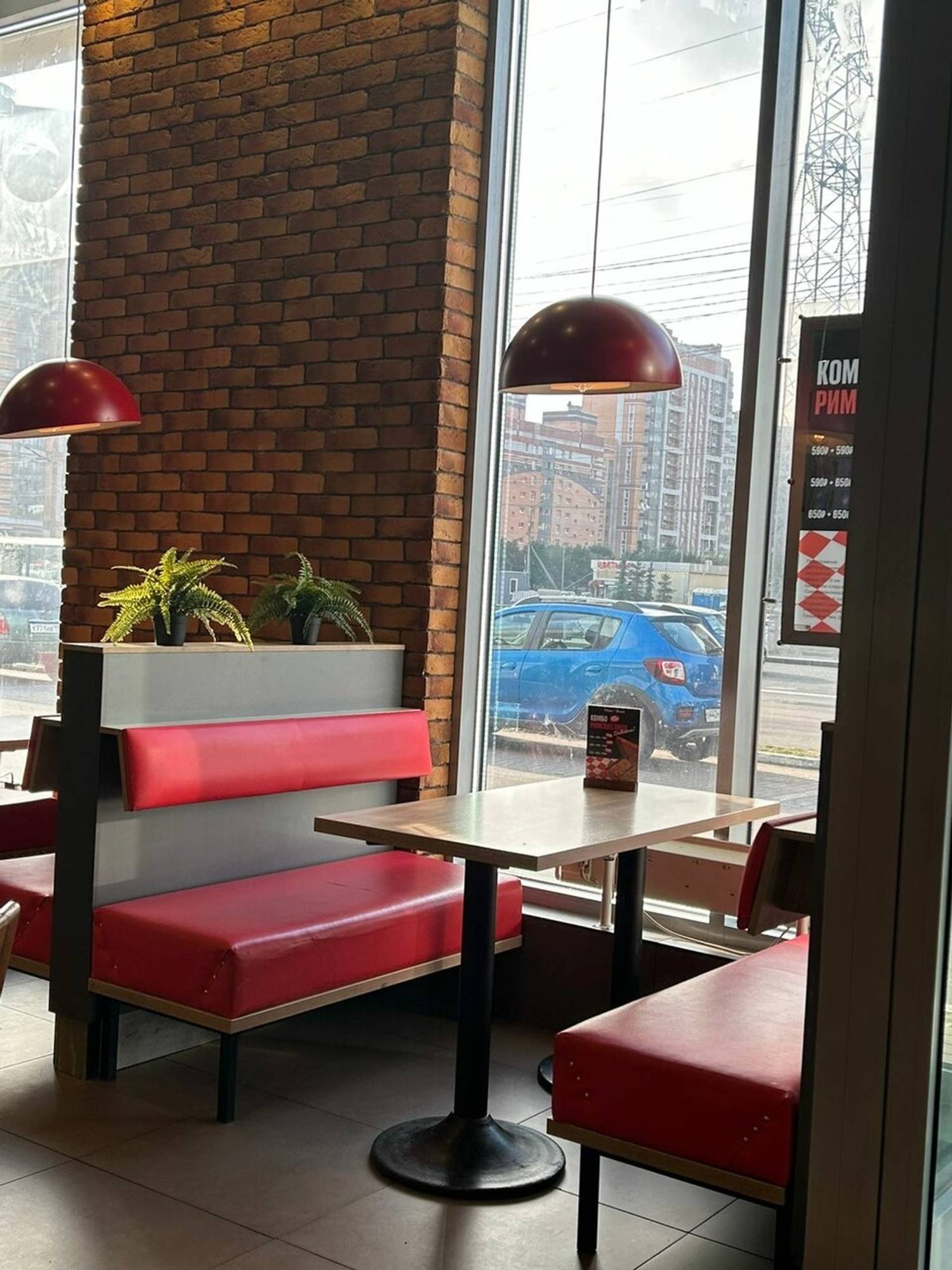 Атмосфера. Интерьер выполнен в характерной для сети цветовой гамме: сочетание черного и красного дополнено деревянными деталями. Само пространство наполнено естественным светом благодаря панорамному остеклению, а из мебели есть как мягкие диванчики для компаний, так и отдельные столики для пар.