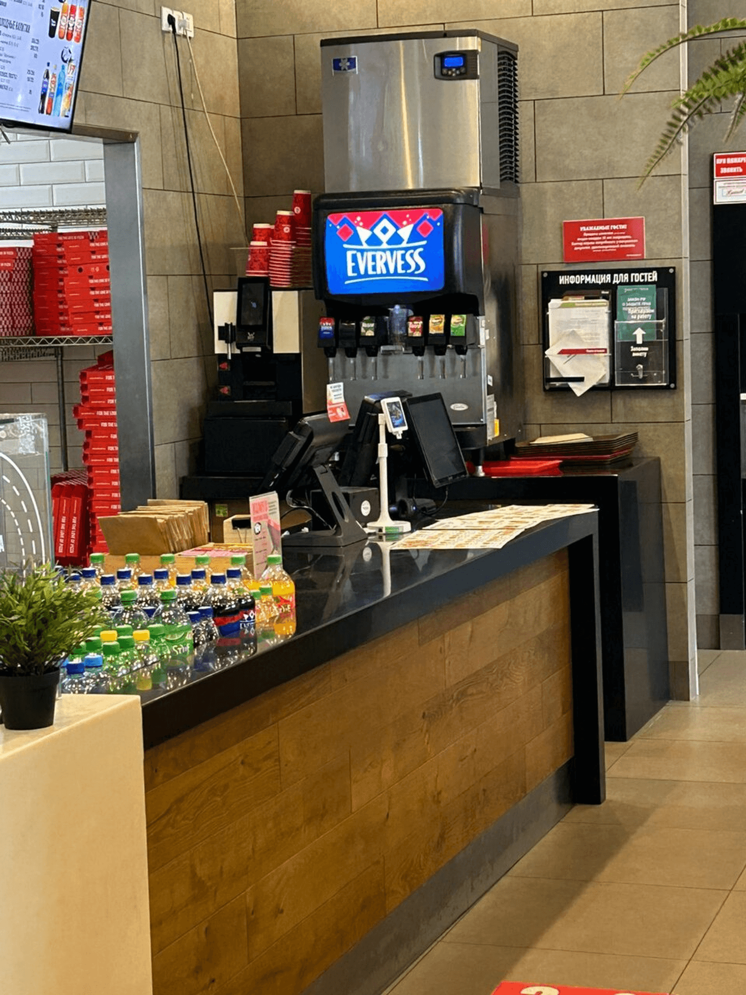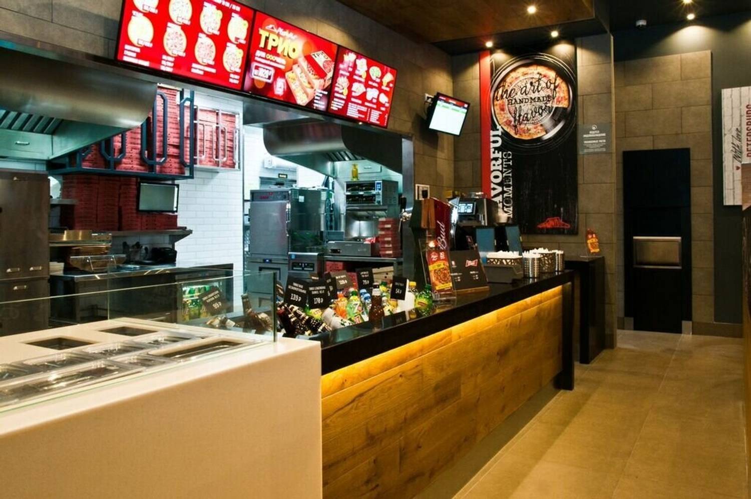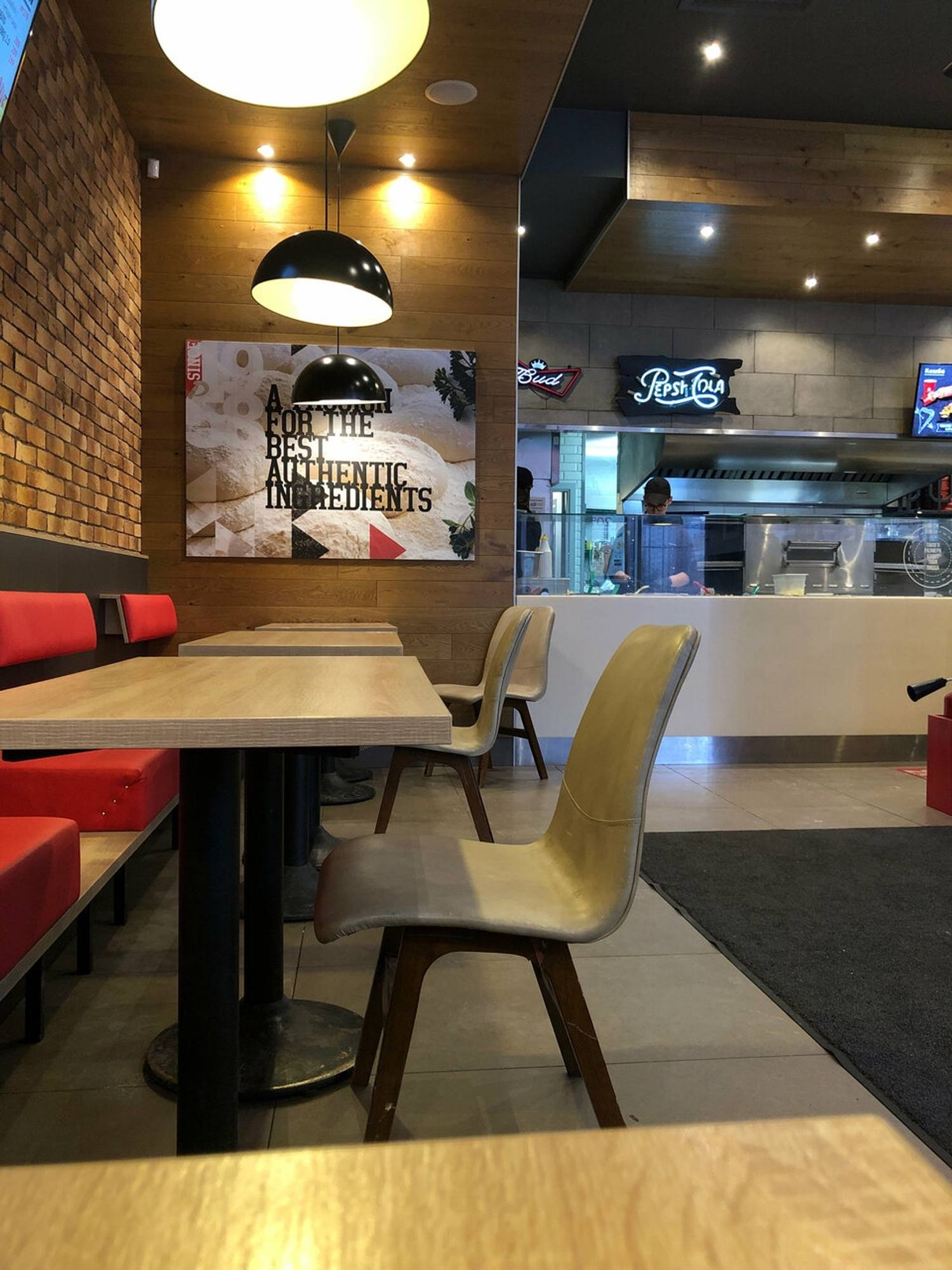 Атмосфера. Интерьер выполнен в характерной для сети цветовой гамме: сочетание черного и красного дополнено деревянными деталями. Само пространство наполнено естественным светом благодаря панорамному остеклению, а из мебели есть как мягкие диванчики для компаний, так и отдельные столики для пар.