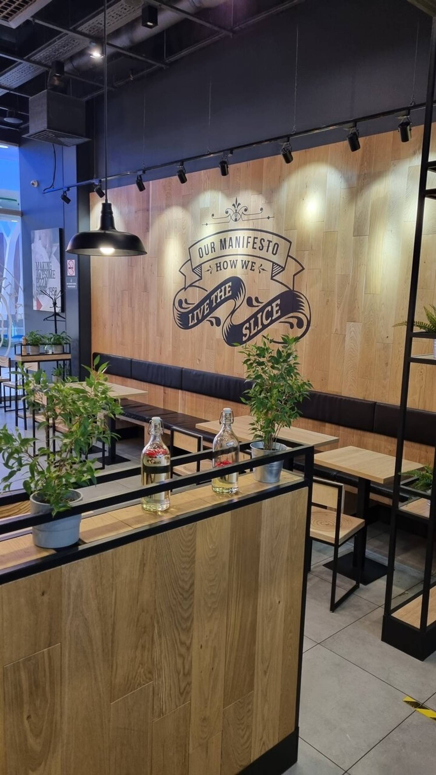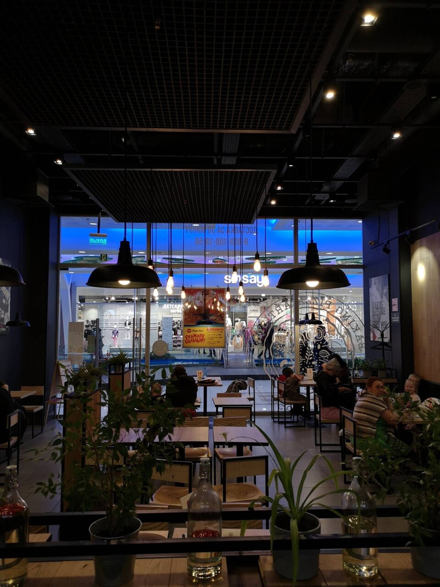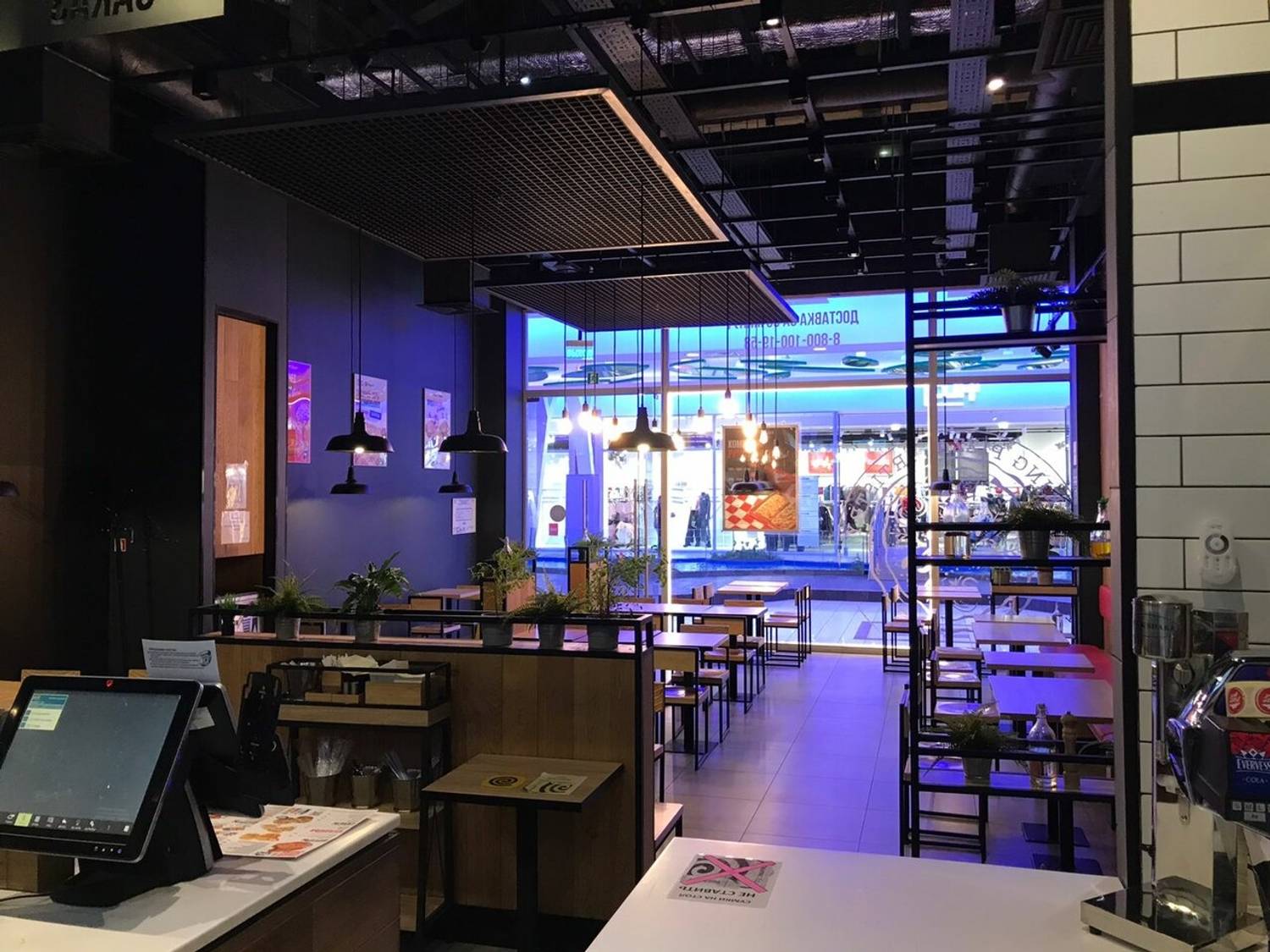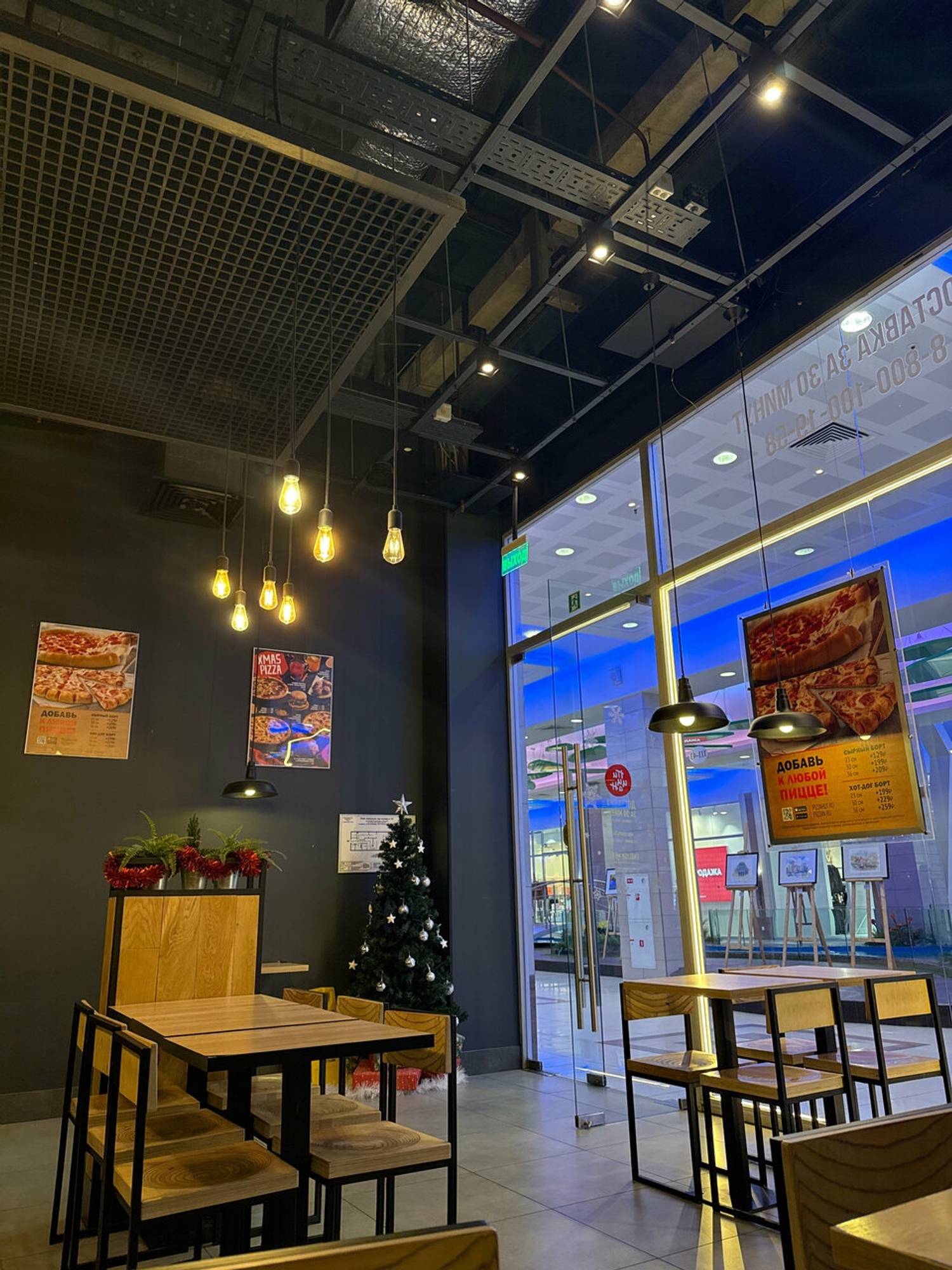 Атмосфера. Пространство в торговой галерее оформлено в фирменной черно-красной гамме с деревянными акцентами. Панорамное остекление делает зал светлым, а гибкая рассадка — от мягких диванчиков для компаний до отдельных столиков — позволяет найти комфортный уголок. Для юных гостей здесь предусмотрены игрушки, которые развлекут малышей, пока готовится заказ.