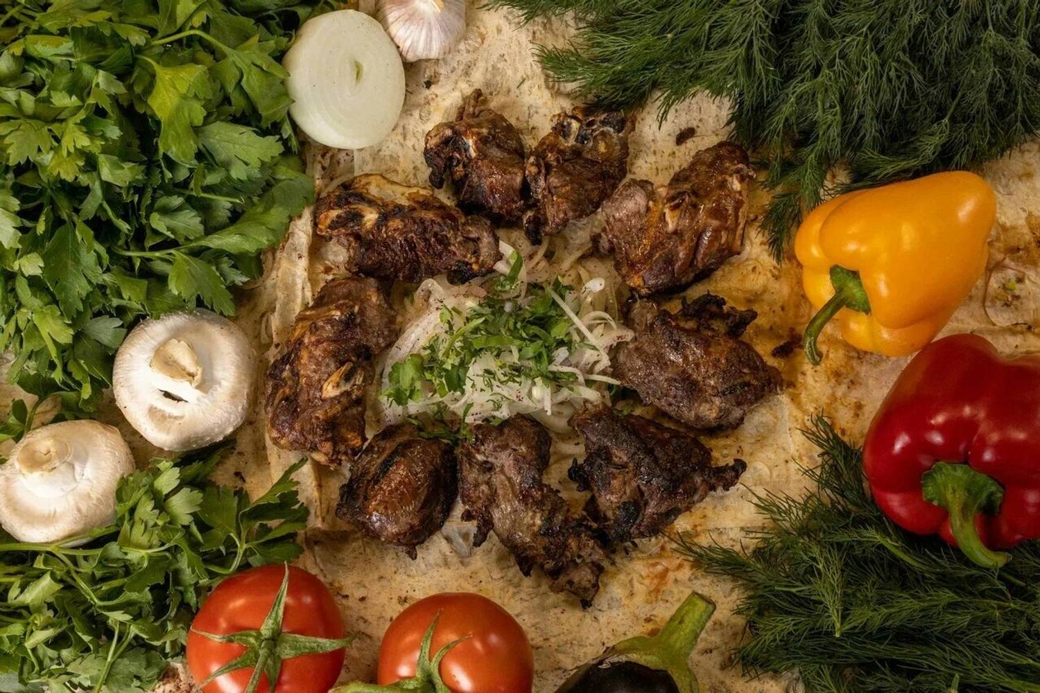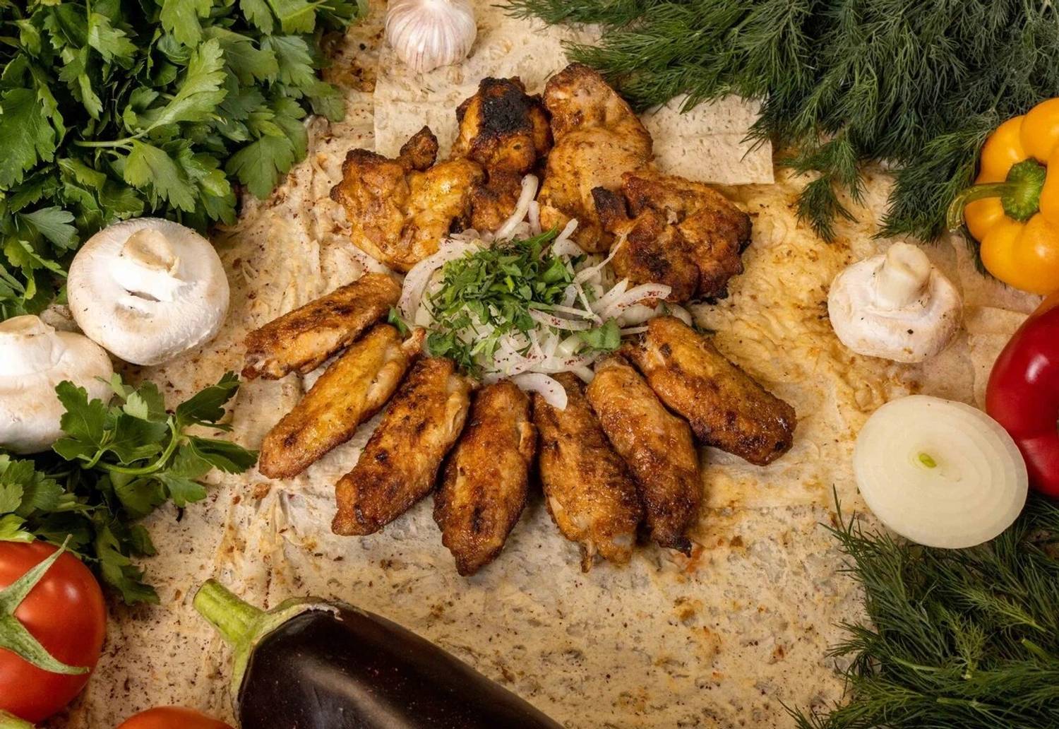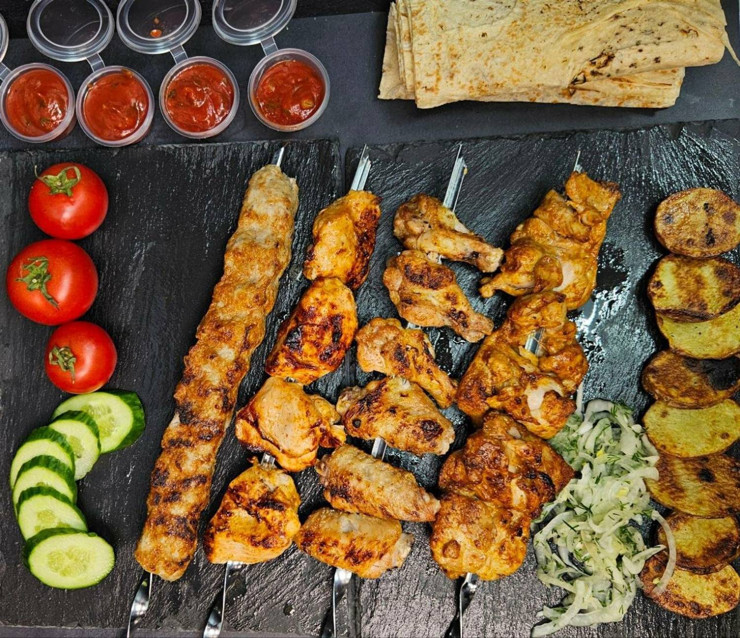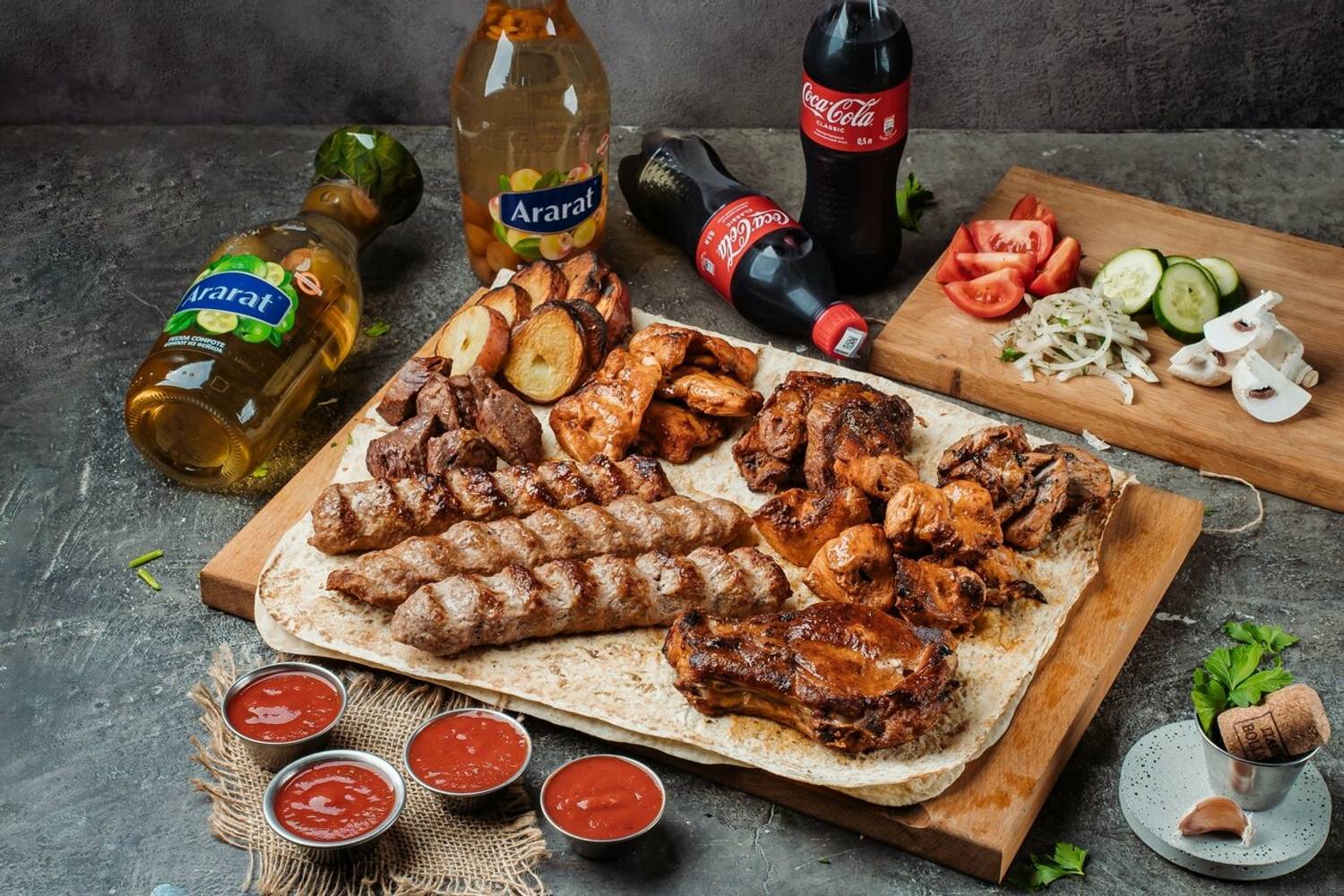 Еда и напитки. Основу меню составляют шашлыки из свиной шеи, бараньей корейки и куриного бедра, а также люля-кебабы из разных видов мяса. Помимо этого подают шаверму на углях с фирменным соусом и бургеры с котлетой, приготовленной на углях. Для компаний предлагают тематические сеты вроде «Страсть» или «Люляшка».