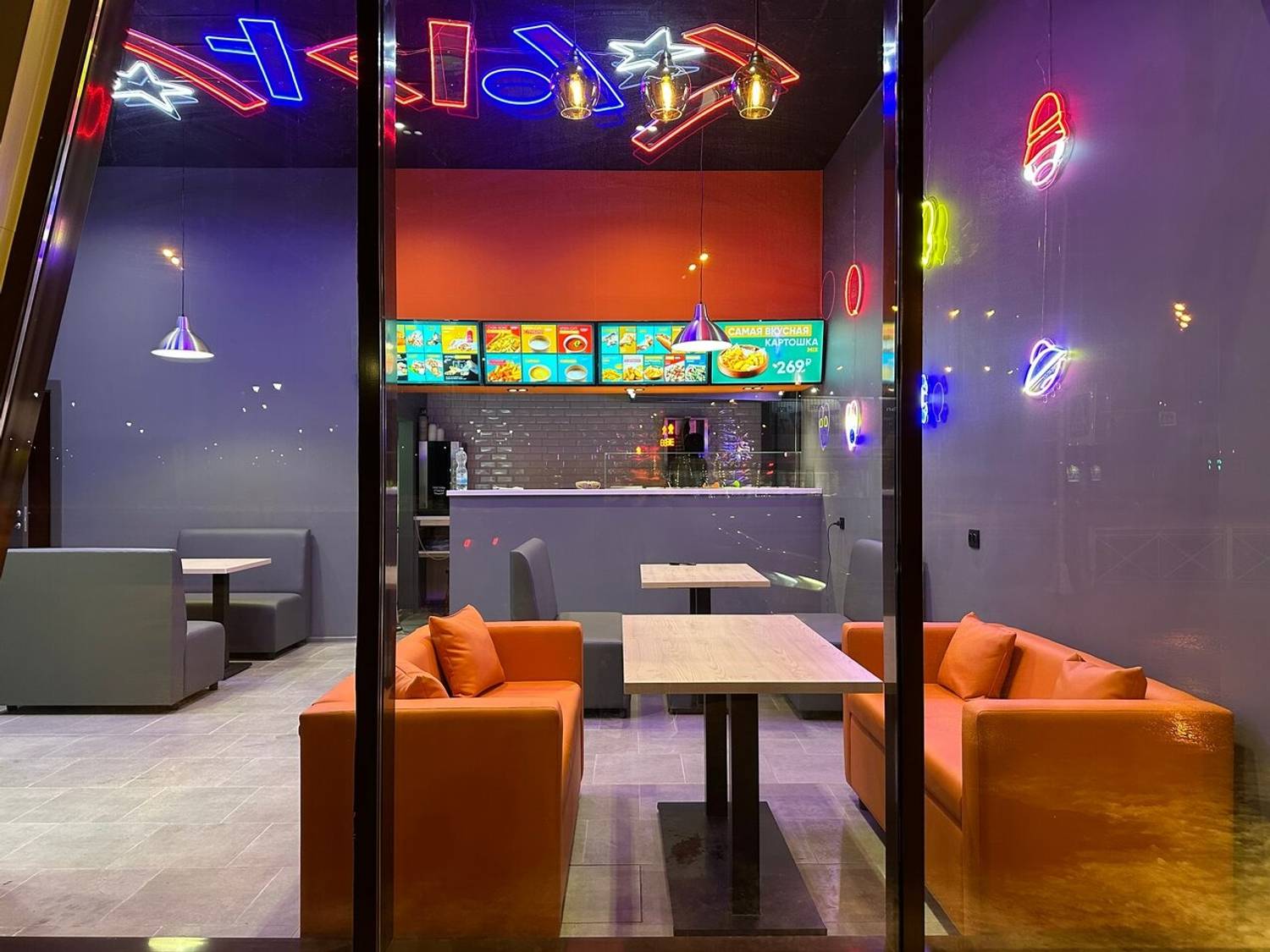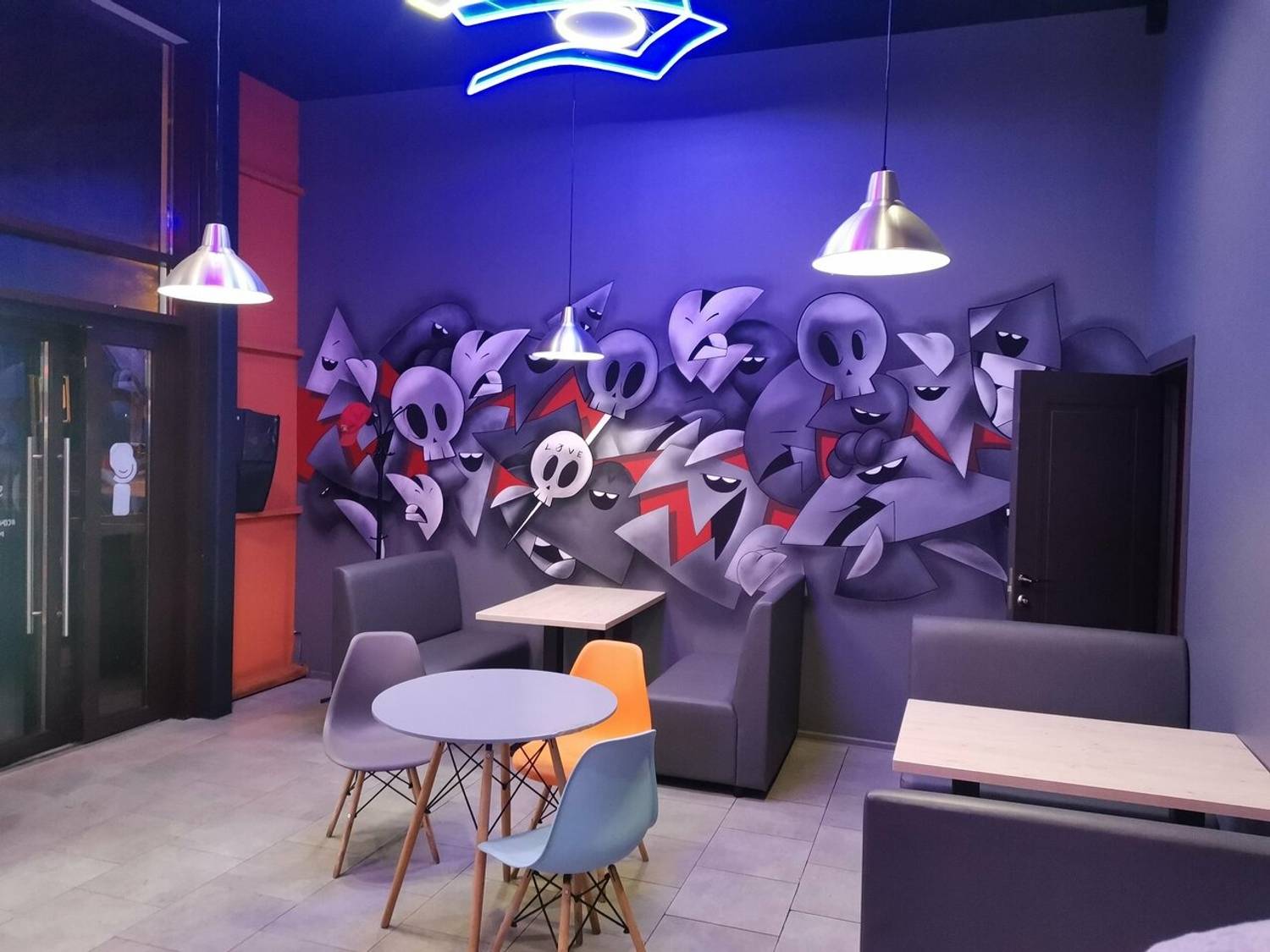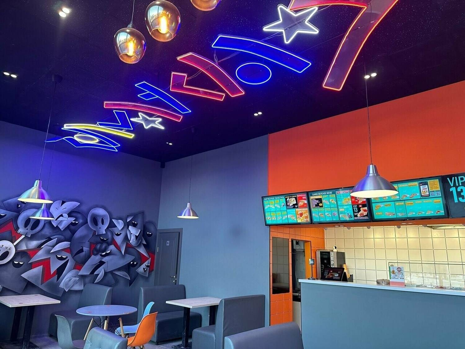 Атмосфера. Пространство заряжено энергией городского ритма. Здесь комфортно как для быстрой паузы, так и для неспешной встречи. Такое ощущение создает современный дизайн с контрастными неоновыми акцентами, удобными пуфиками и открытой кухней, откуда доносятся аппетитные ароматы. Интерьер с динамичными линиями и яркими деталями задает непринужденный, живой тон.