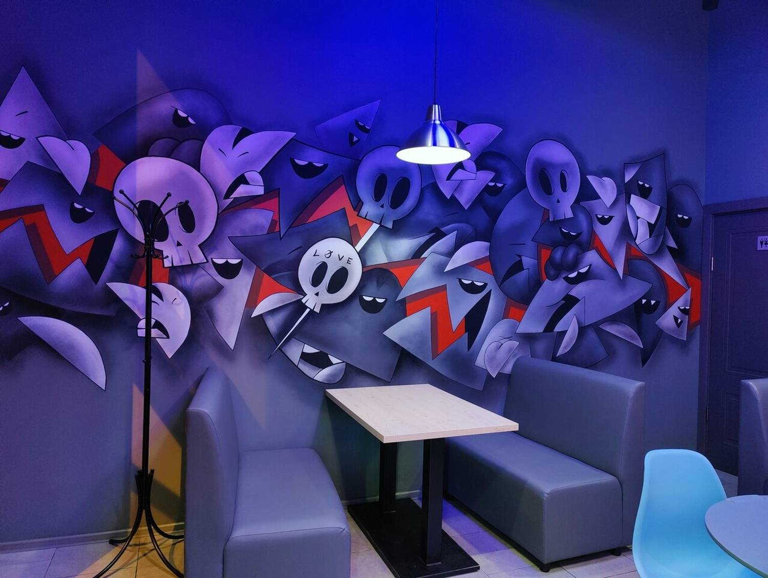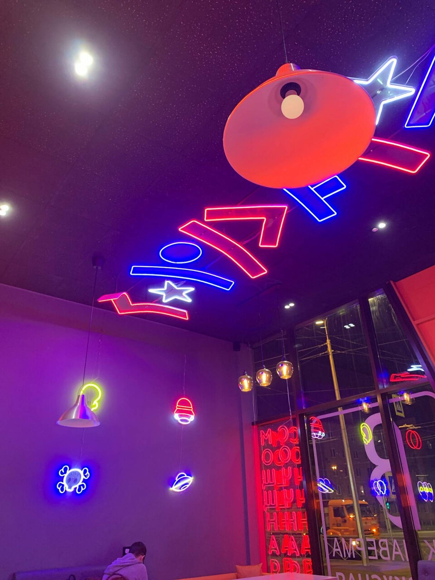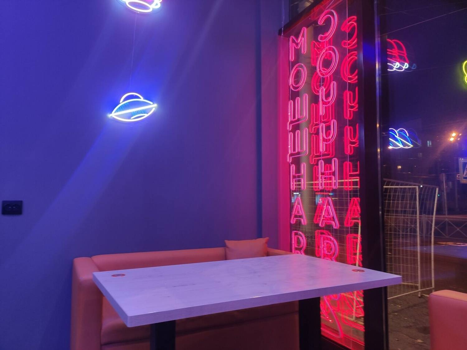 Атмосфера. Пространство заряжено энергией городского ритма. Здесь комфортно как для быстрой паузы, так и для неспешной встречи. Такое ощущение создает современный дизайн с контрастными неоновыми акцентами, удобными пуфиками и открытой кухней, откуда доносятся аппетитные ароматы. Интерьер с динамичными линиями и яркими деталями задает непринужденный, живой тон.