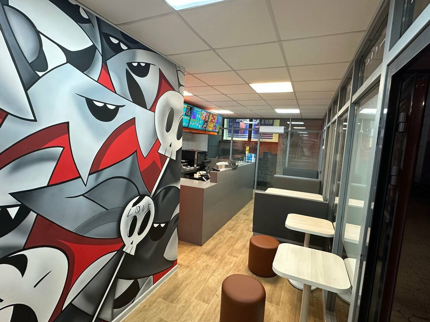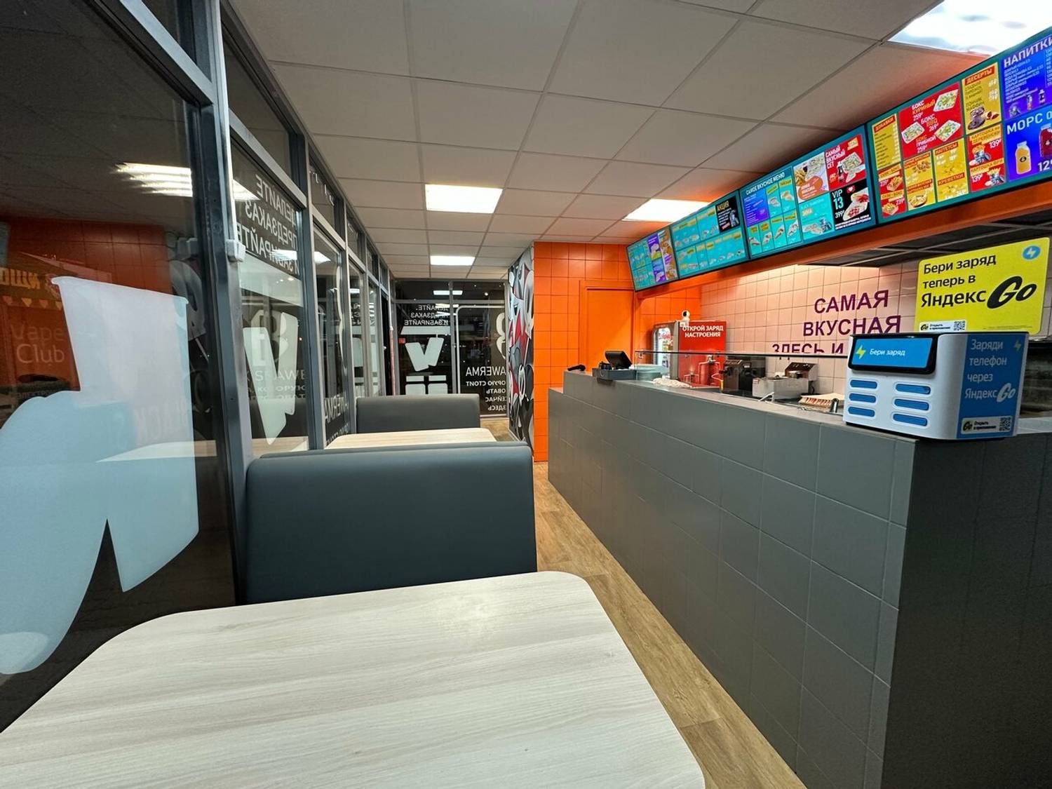 Атмосфера. Заведение создает ощущение знакомого и предсказуемо хорошего места, куда можно зайти после работы или прогулки. Интерьер в фирменном стиле с ярким граффити, удобными диванчиками, оранжевыми элементами и мягким светом неоновых вывесок создает стильную и расслабляющую обстановку. Здесь будет комфортно по-быстрому перекусить в одиночку или с друзьями.