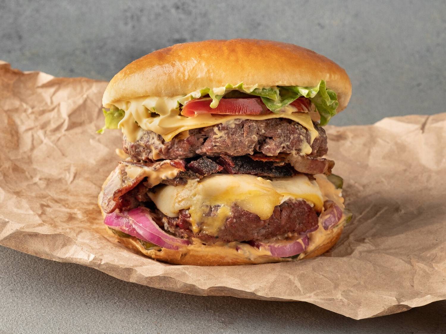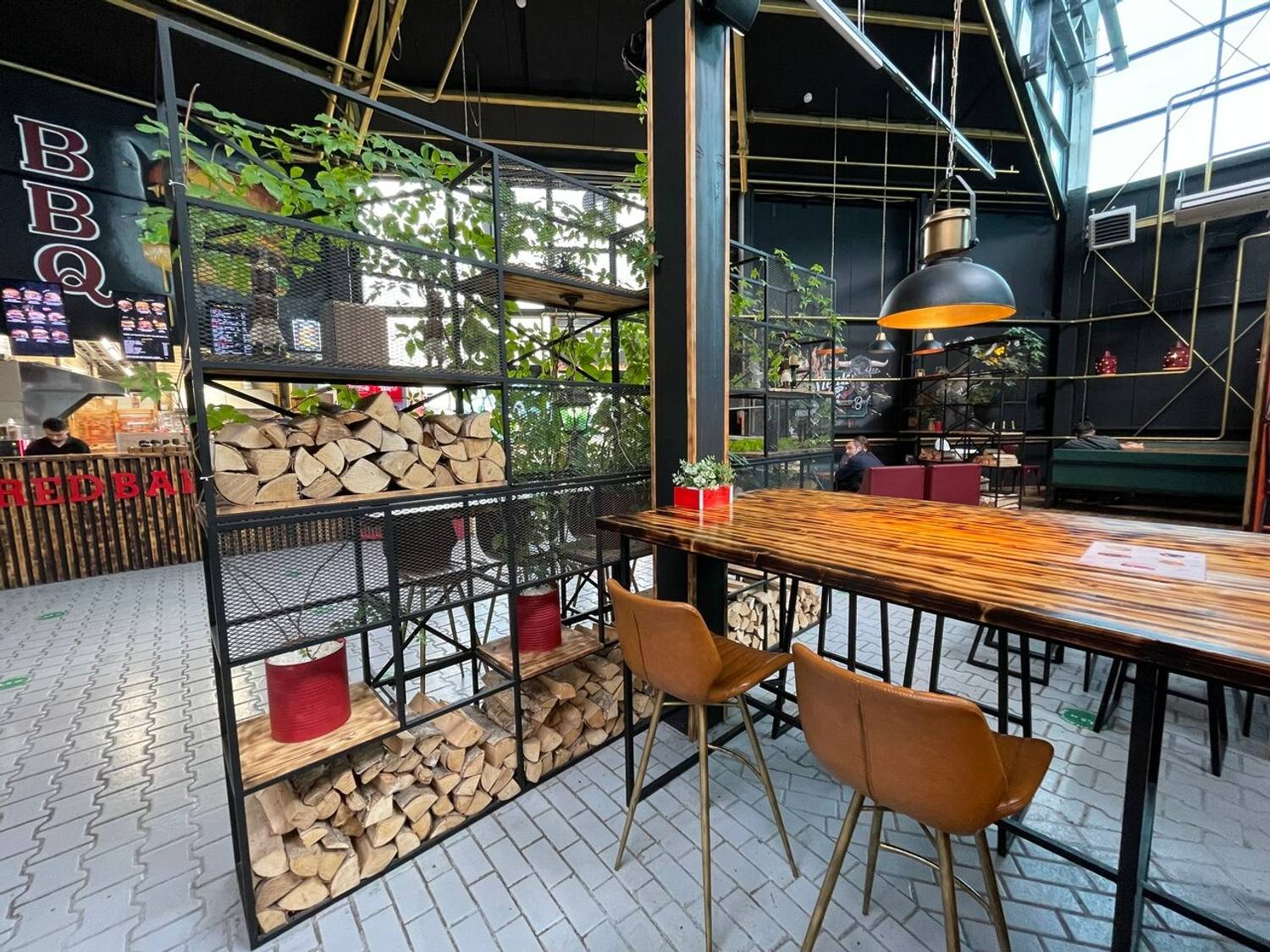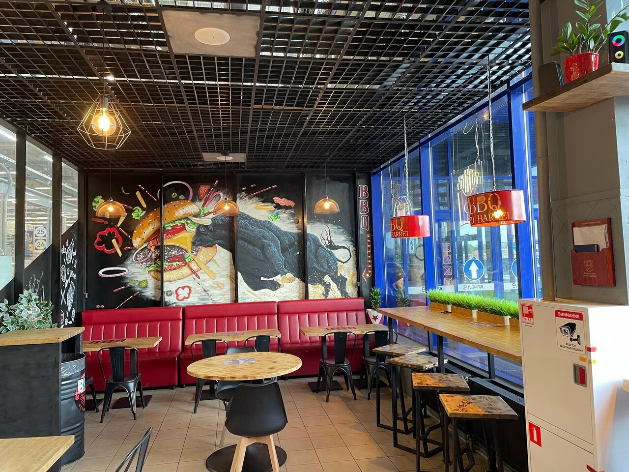 Атмосфера. Лаконичный, стильный ресторан с яркими рисунками быка и бургера на стене. Дерзкий дизайн дополняют красные кожаные кресла, массивные круглые деревянные столы и синие оконные рамы. Интерьер сочетает индустриальные ноты с теплотой дерева и располагает к долгому застолью и общению.