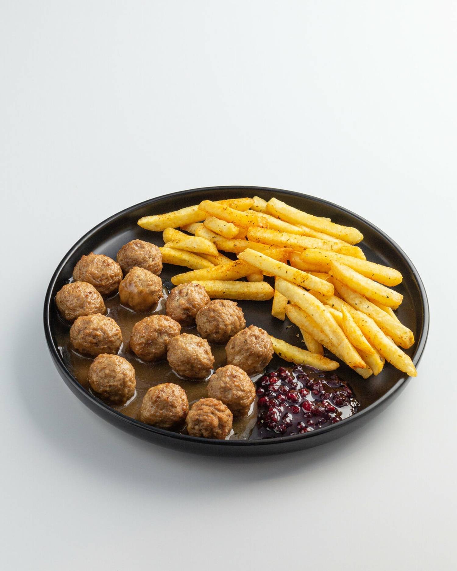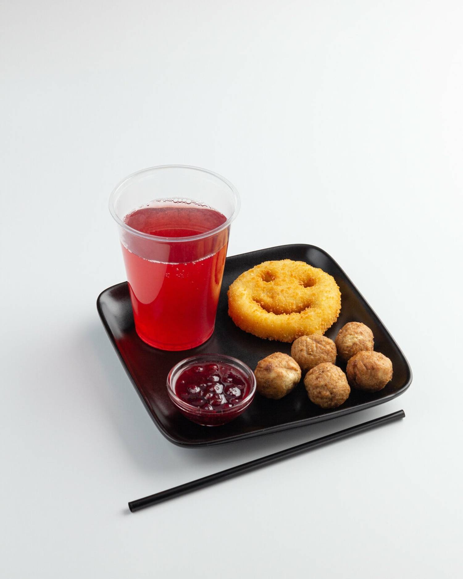 Еда и напитки. В основе меню — фрикадельки по шведскому рецепту, которые можно комбинировать с разными соусами, включая классический брусничный. К ним предлагают на выбор гарниры: от нежного пюре и батата до гречки и брокколи. Для полноценного обеда можно дополнить заказ сырным супом, хот-догом или колбасками, а также выбрать чай или лимонад.