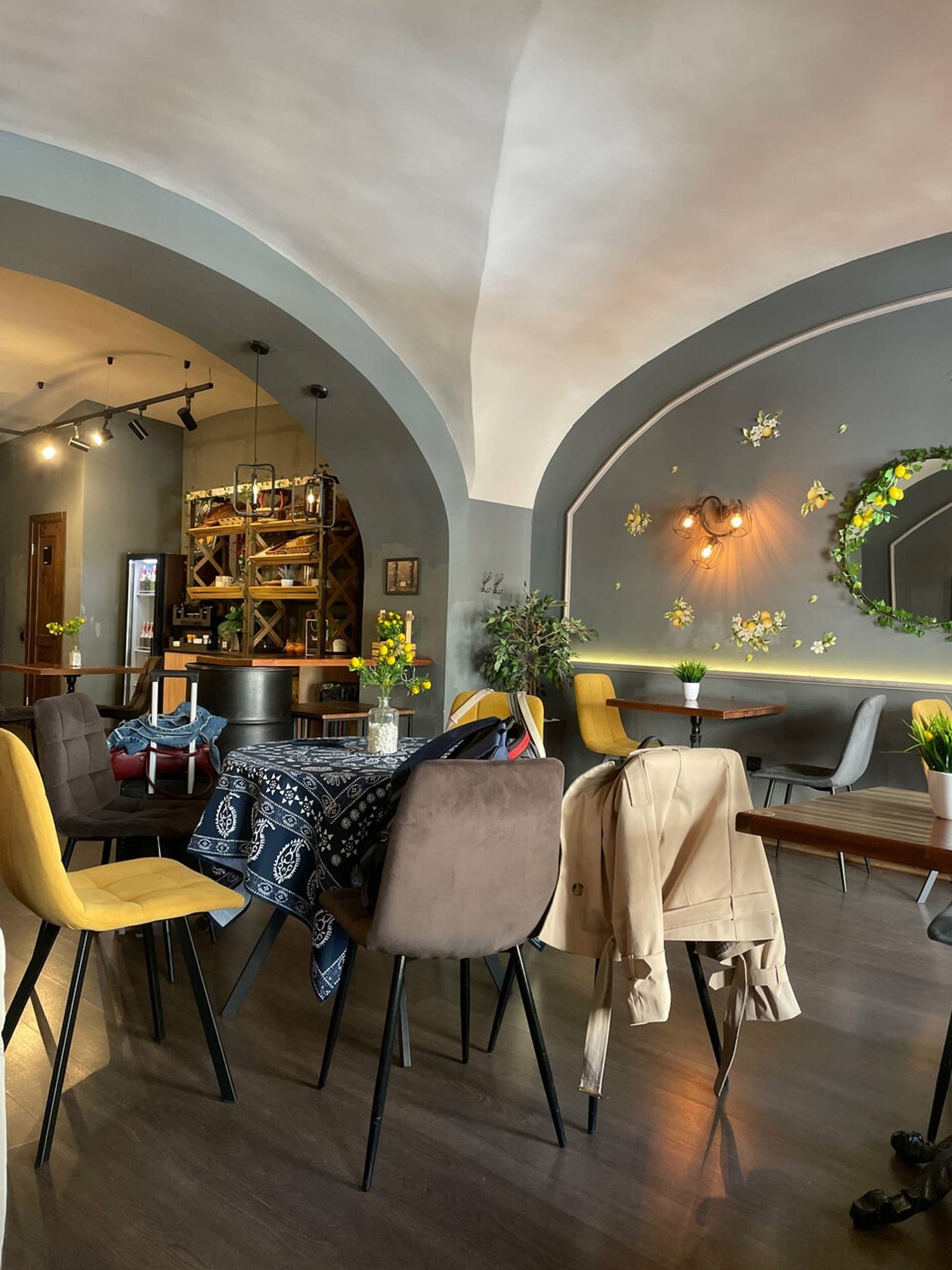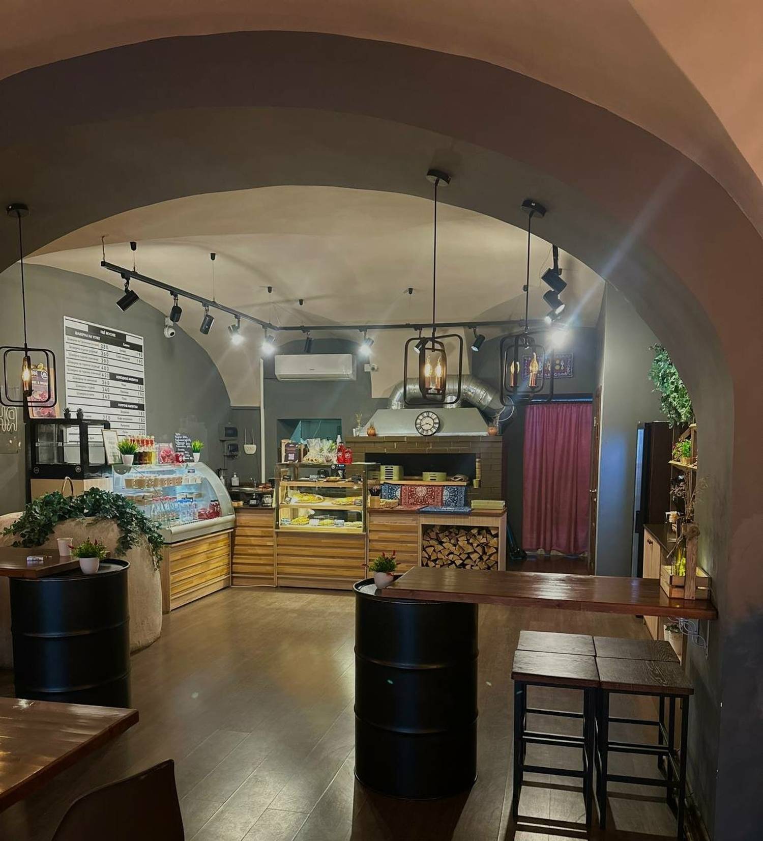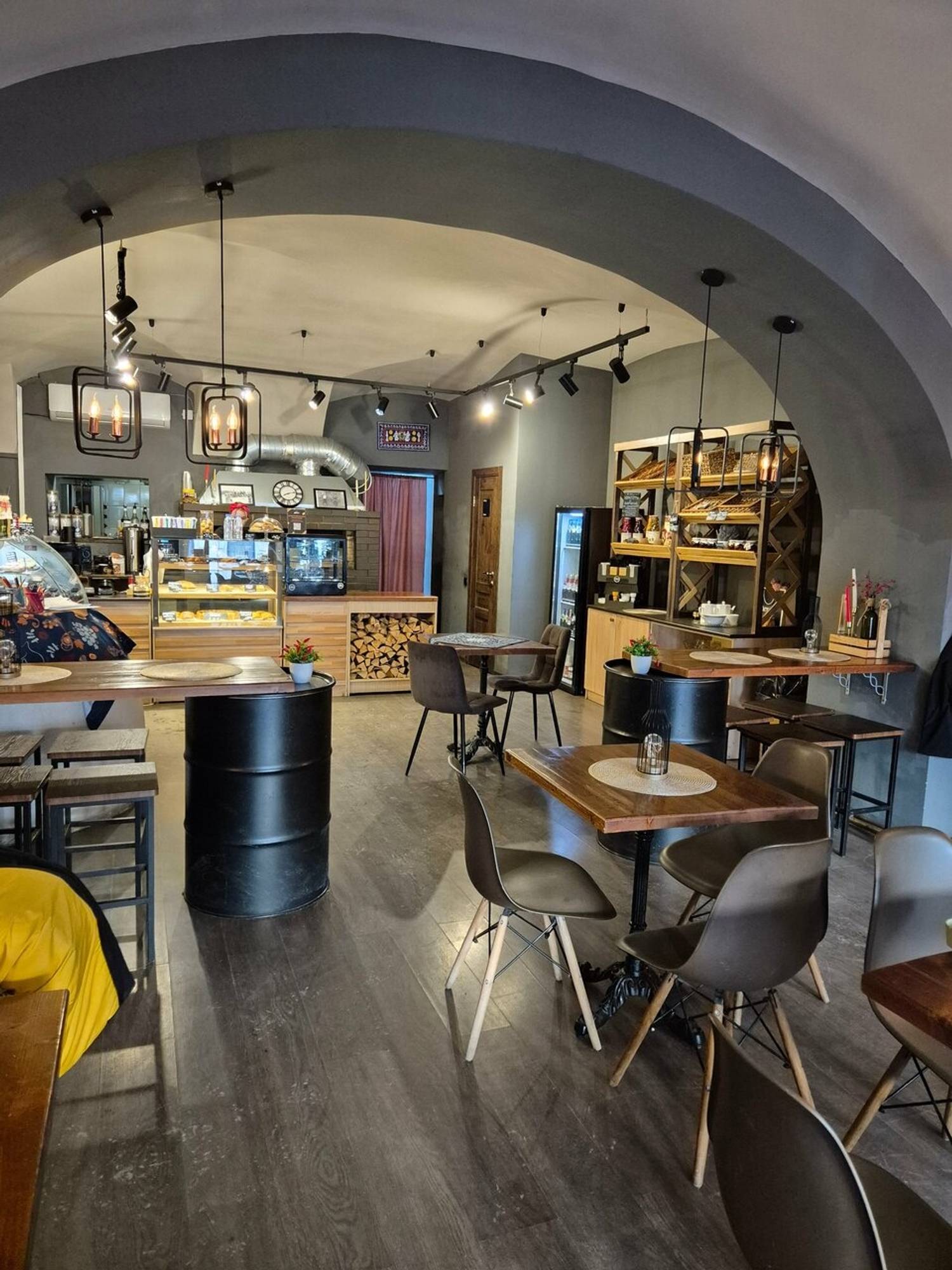 Атмосфера. Место создает ощущение современного и практичного пространства, где одновременно нашлось место стилю и даже некой богемности. Простой, но стильный интерьер со сводчатыми потолками, стенами в серо-белых тонах, дизайнерскими светильниками и лакированными стульями выглядит лаконично и элегантно. Это подходящий вариант для делового ланча, неформальной встречи или того, чтобы заказать готовый ужин домой после рабочего дня.