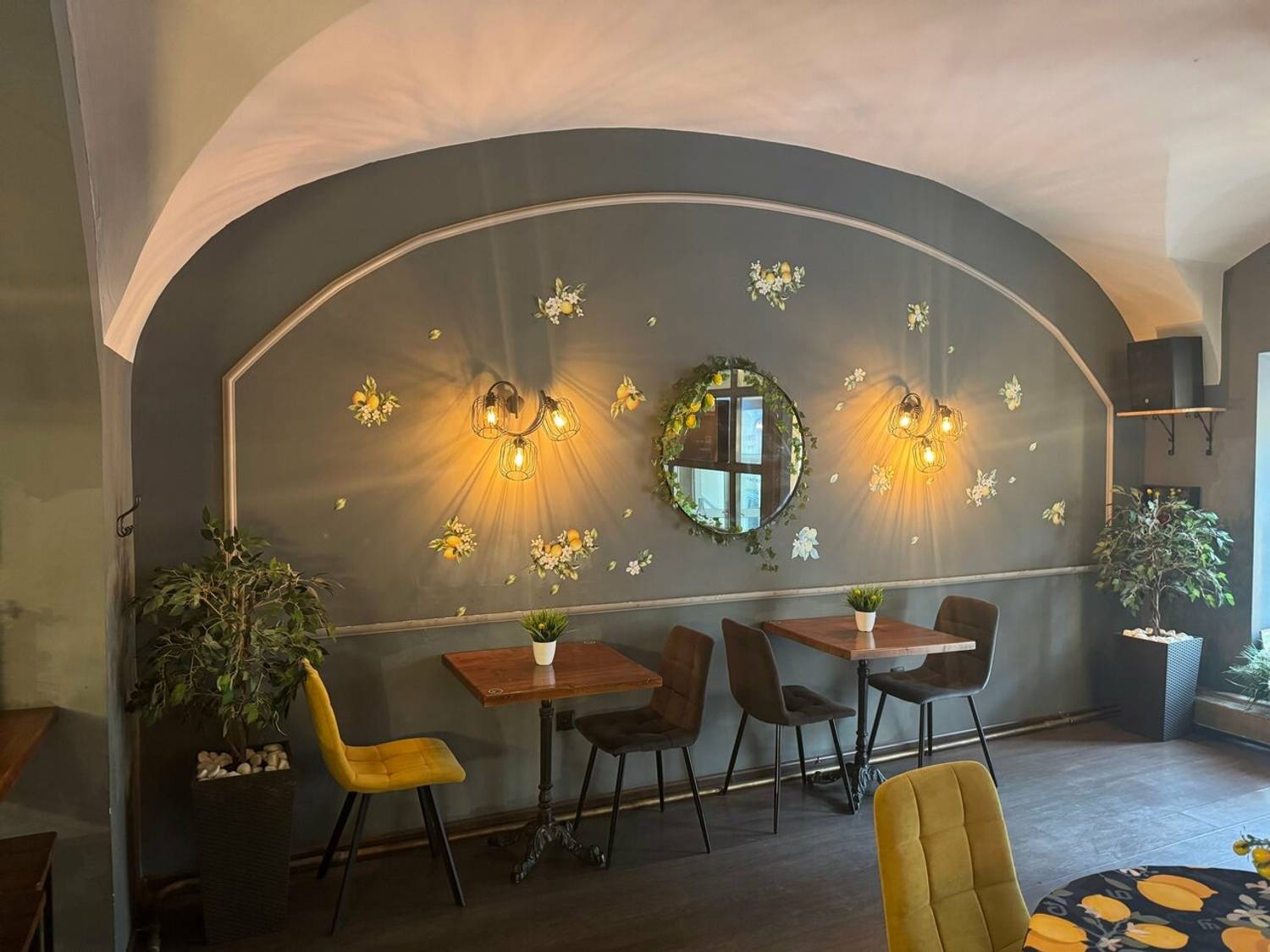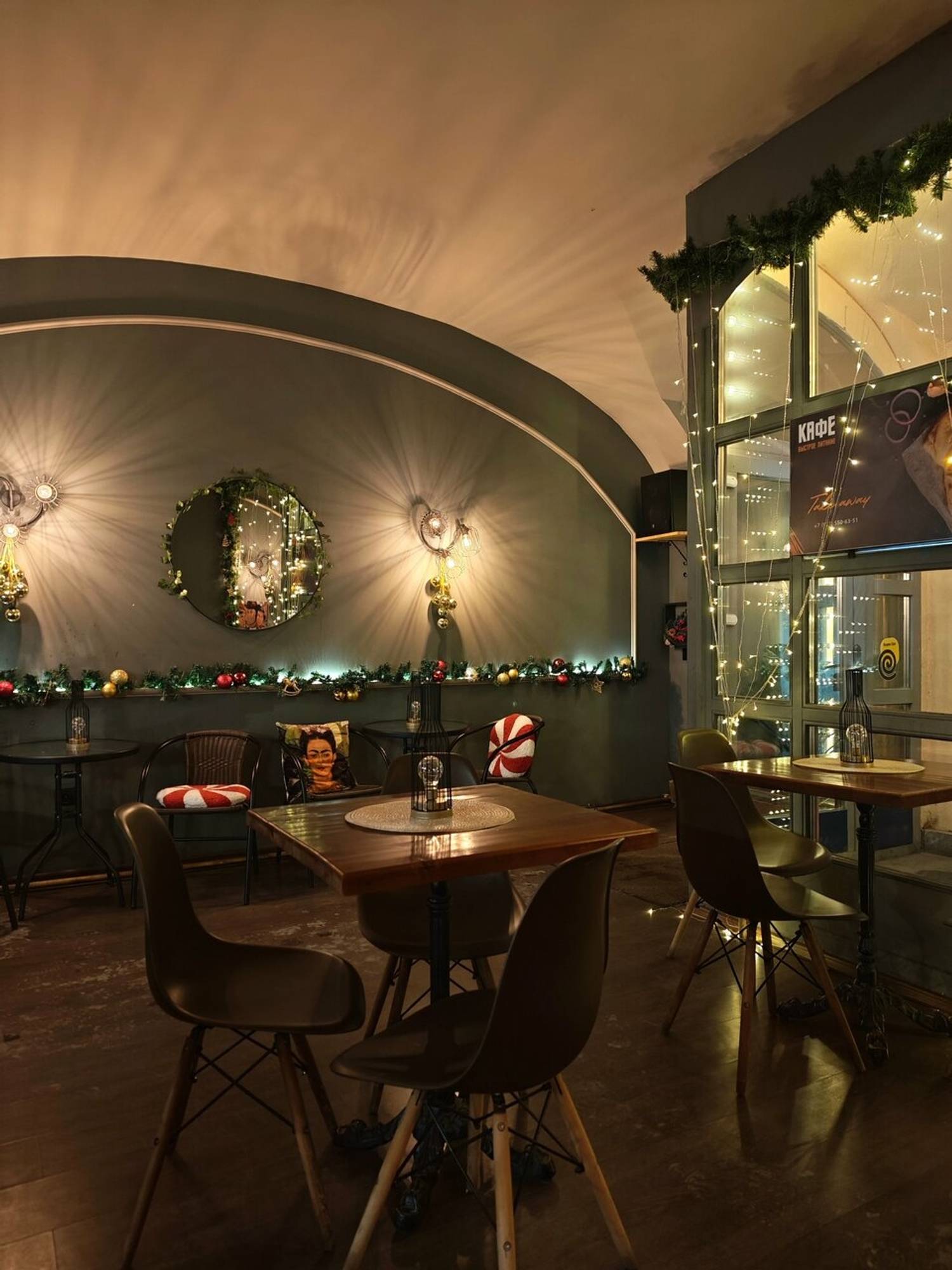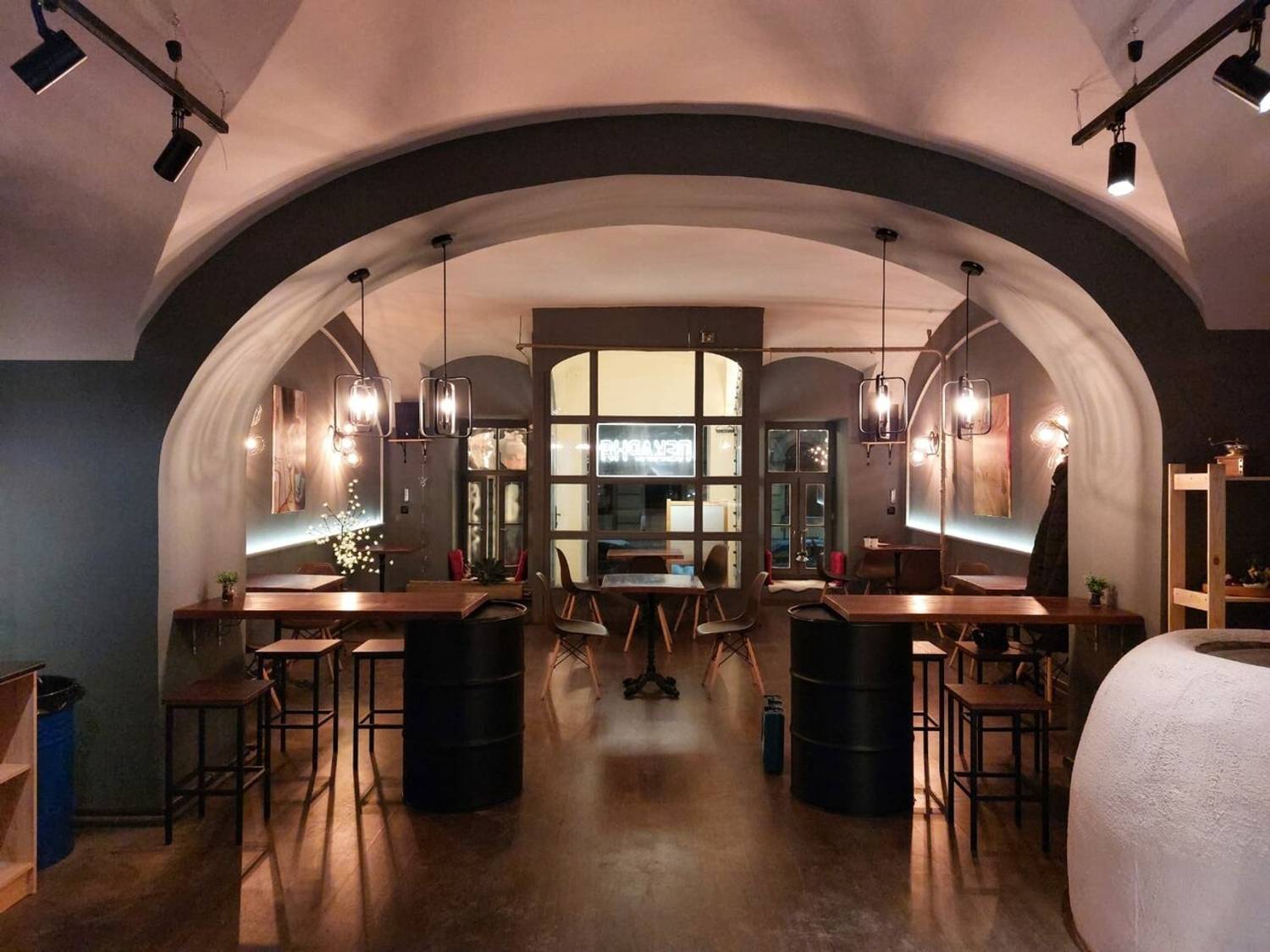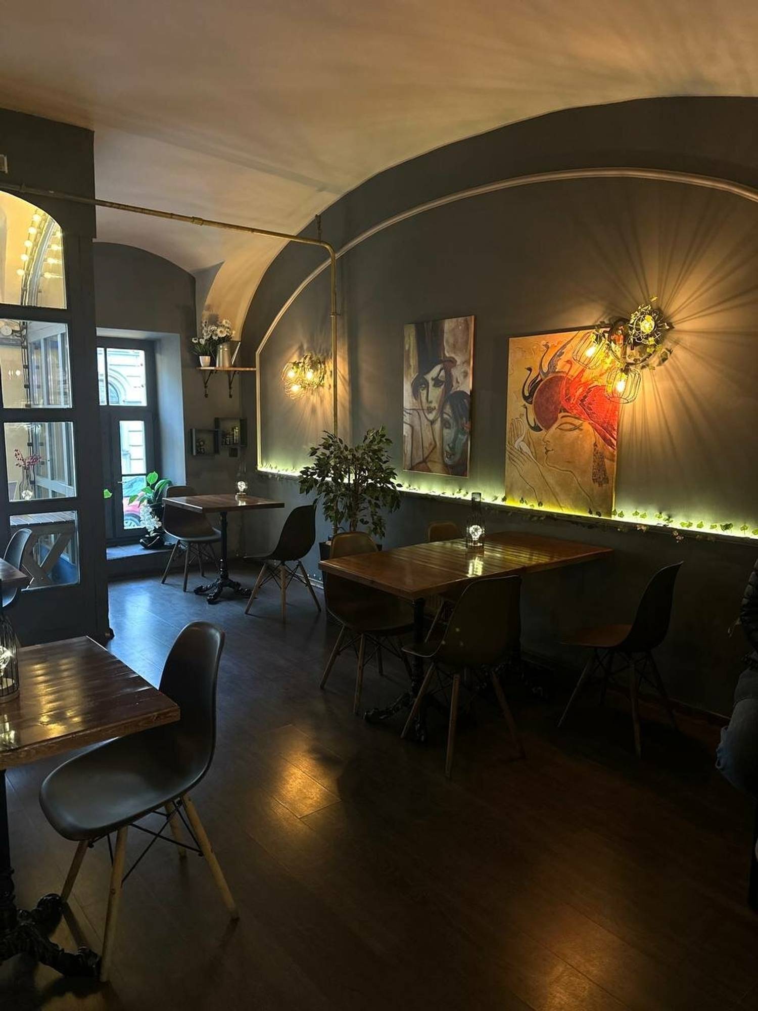 Атмосфера. Место создает ощущение современного и практичного пространства, где одновременно нашлось место стилю и даже некой богемности. Простой, но стильный интерьер со сводчатыми потолками, стенами в серо-белых тонах, дизайнерскими светильниками и лакированными стульями выглядит лаконично и элегантно. Это подходящий вариант для делового ланча, неформальной встречи или того, чтобы заказать готовый ужин домой после рабочего дня.