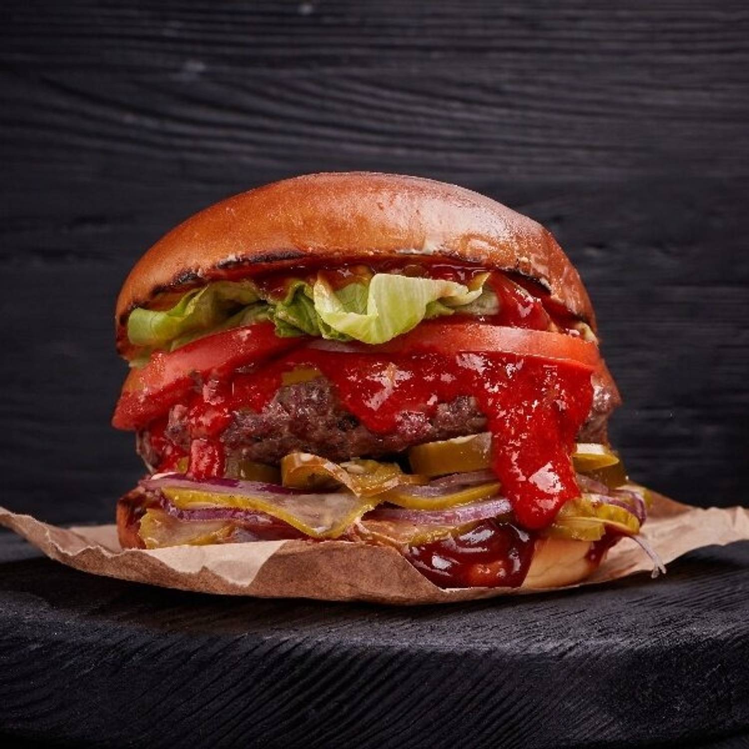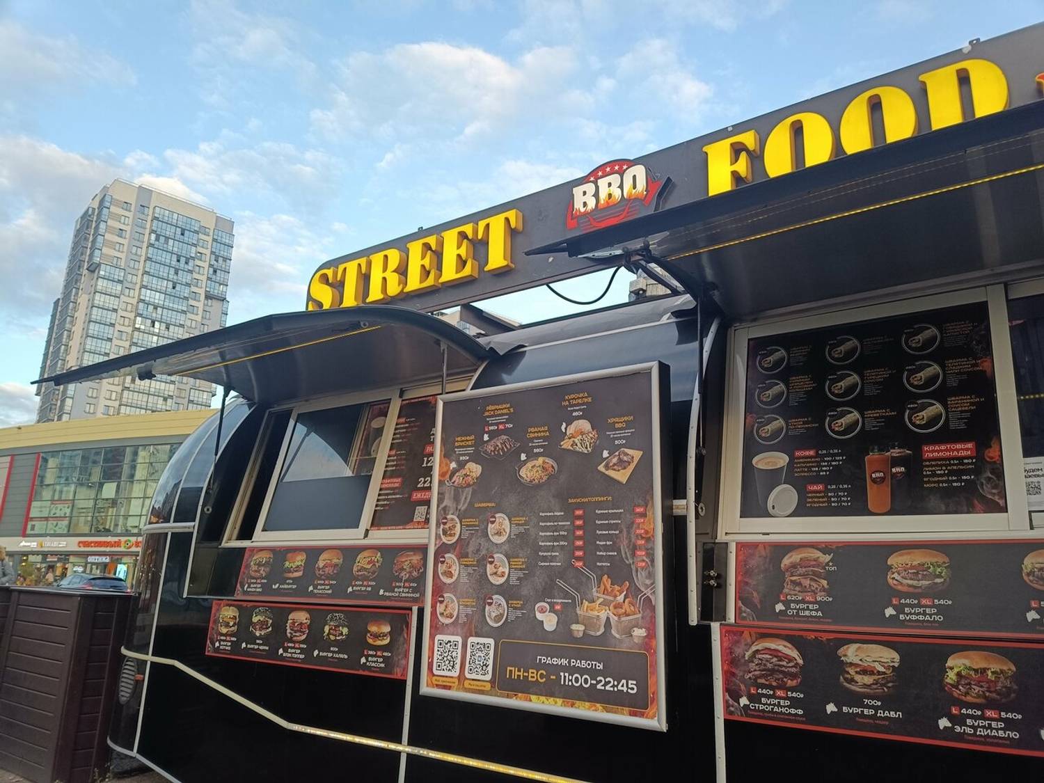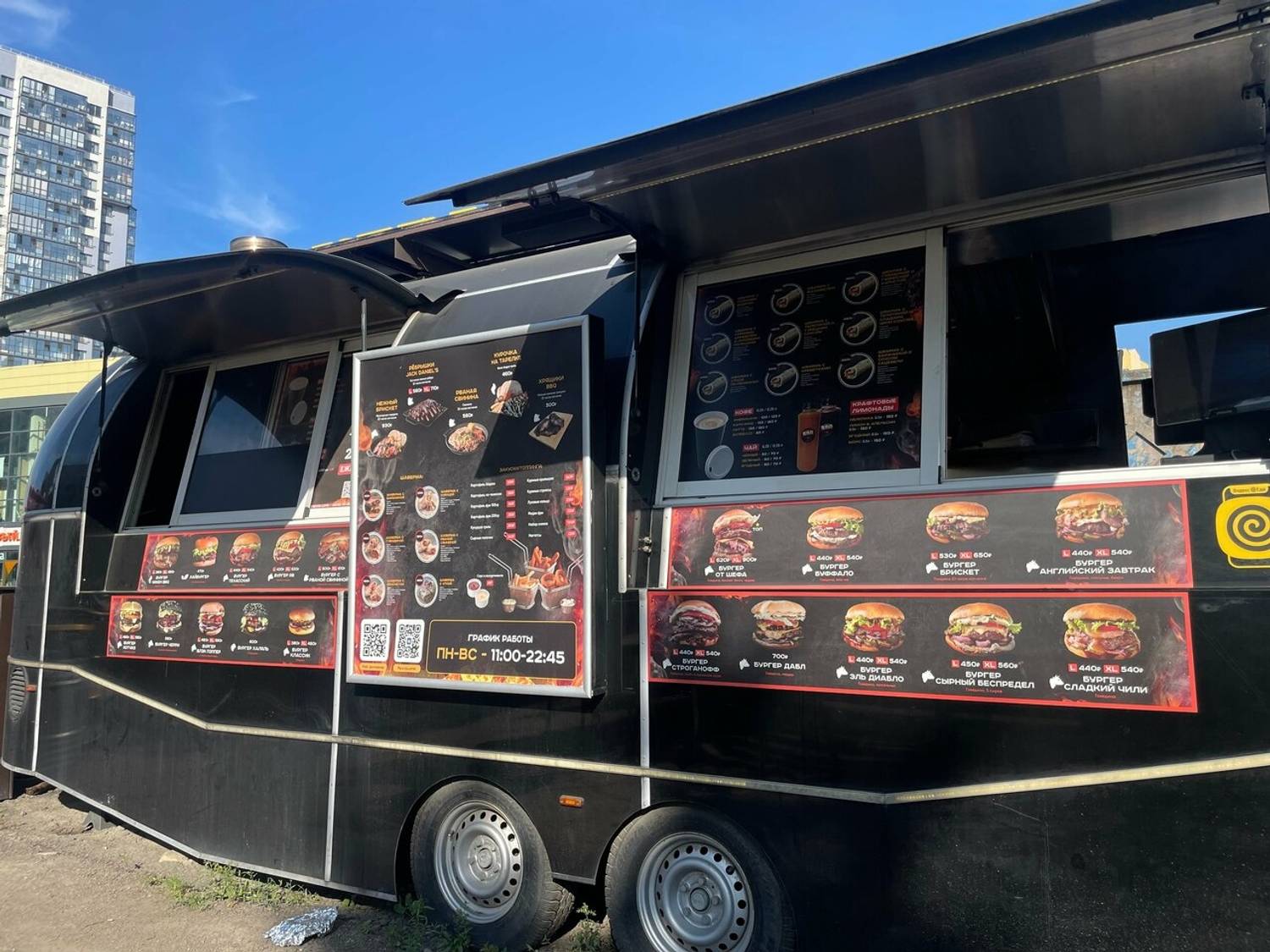 Атмосфера. Яркий красно-черный фудтрак с понятным меню на вывеске сразу создает образ американского roadside-питания. Простые деревянные столики и бочки вместо стульев рядом с трейлером добавляют атмосферы импровизированного пикника, где можно быстро перекусить после дел в городе или заказать бургер с собой.