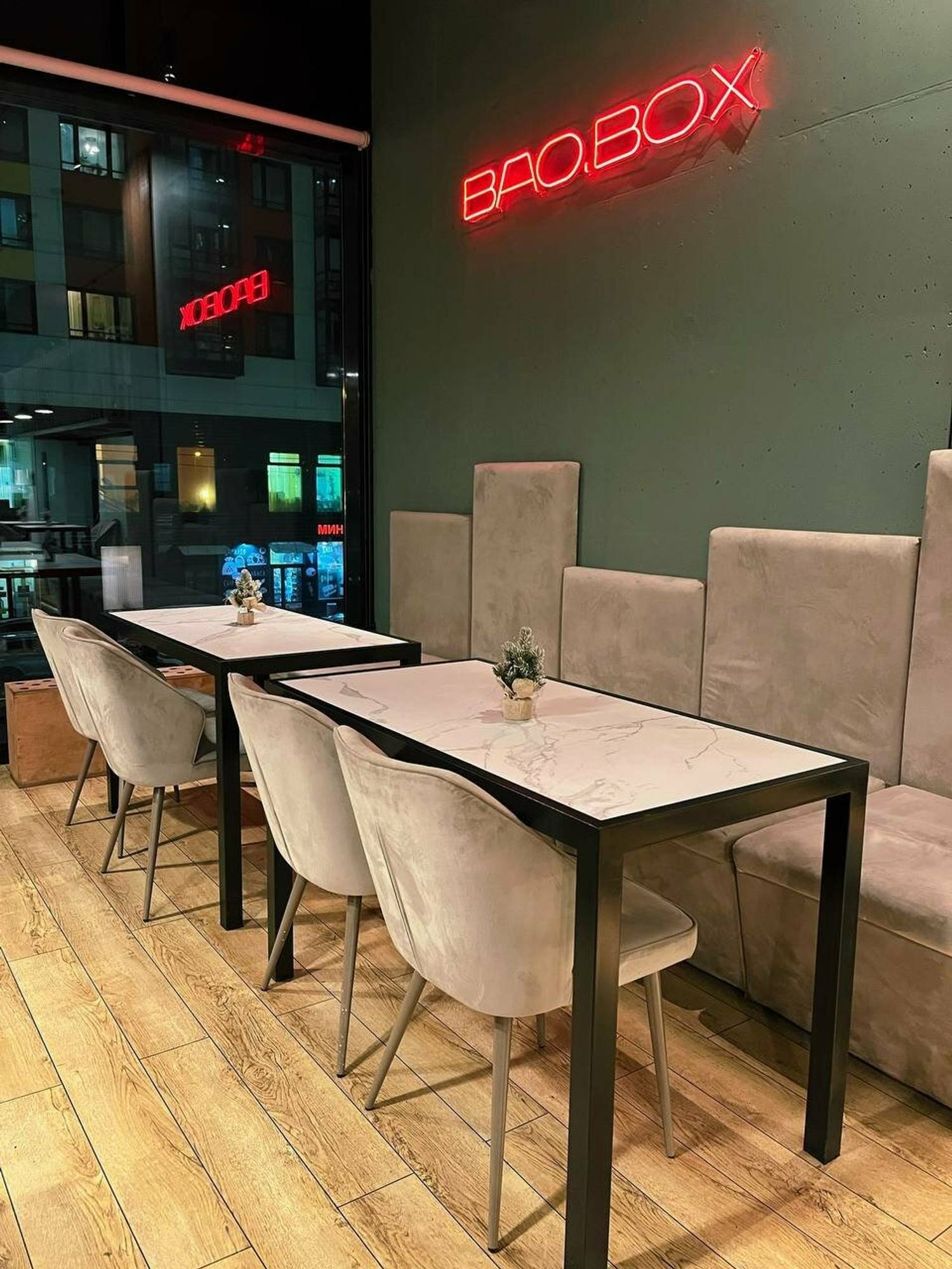 Атмосфера. Интерьер выдержан в лаконичном современном стиле: чистые линии, нейтральные тона и минимум декора. Пространство организовано так, чтобы гости могли сосредоточиться на вкусе — будь то быстрый перекус в одиночку или встреча с друзьями. Здесь нет нарочитой экзотики, но чувствуется уважение к азиатской эстетике: все строго, функционально и со вкусом.