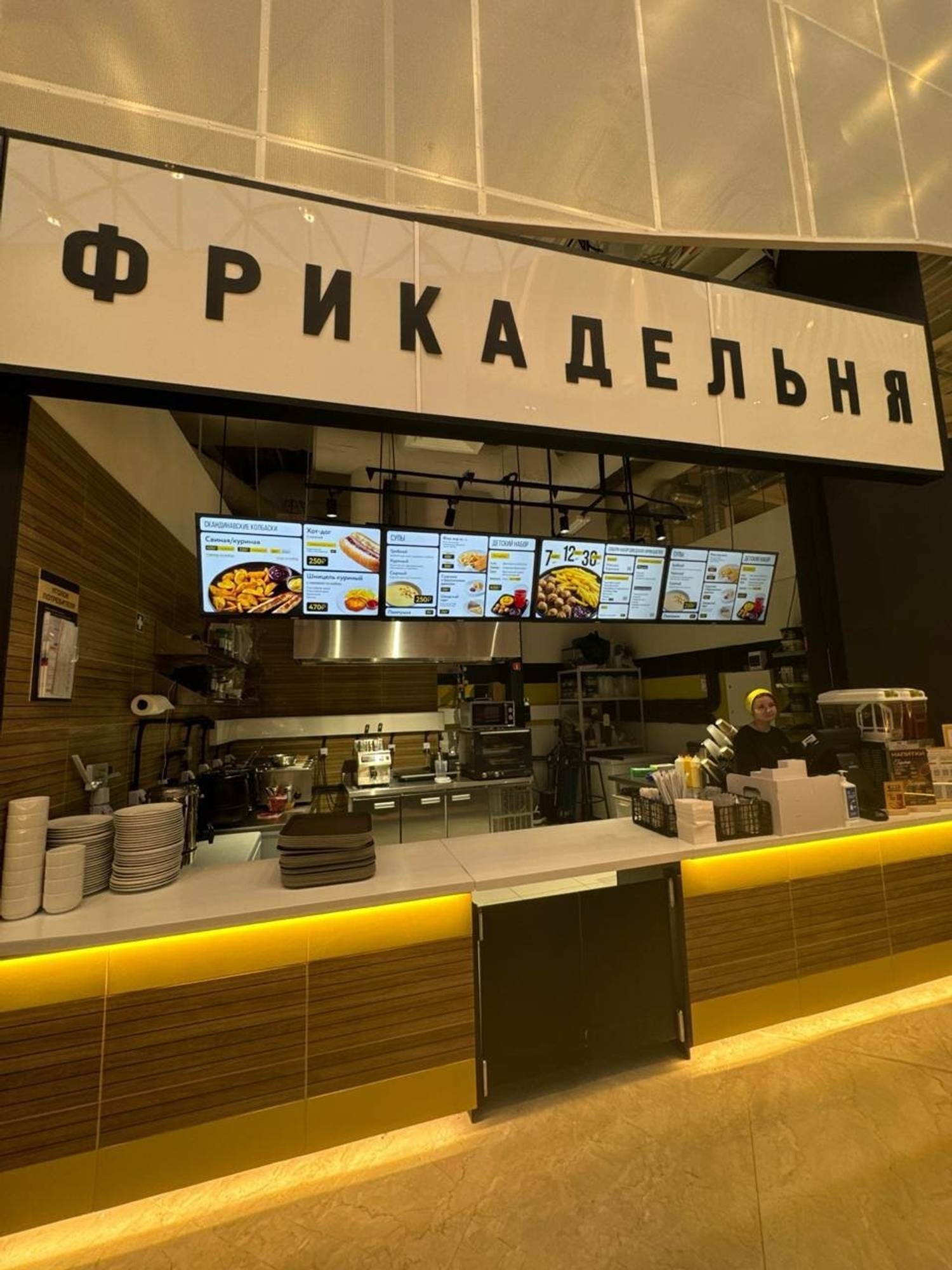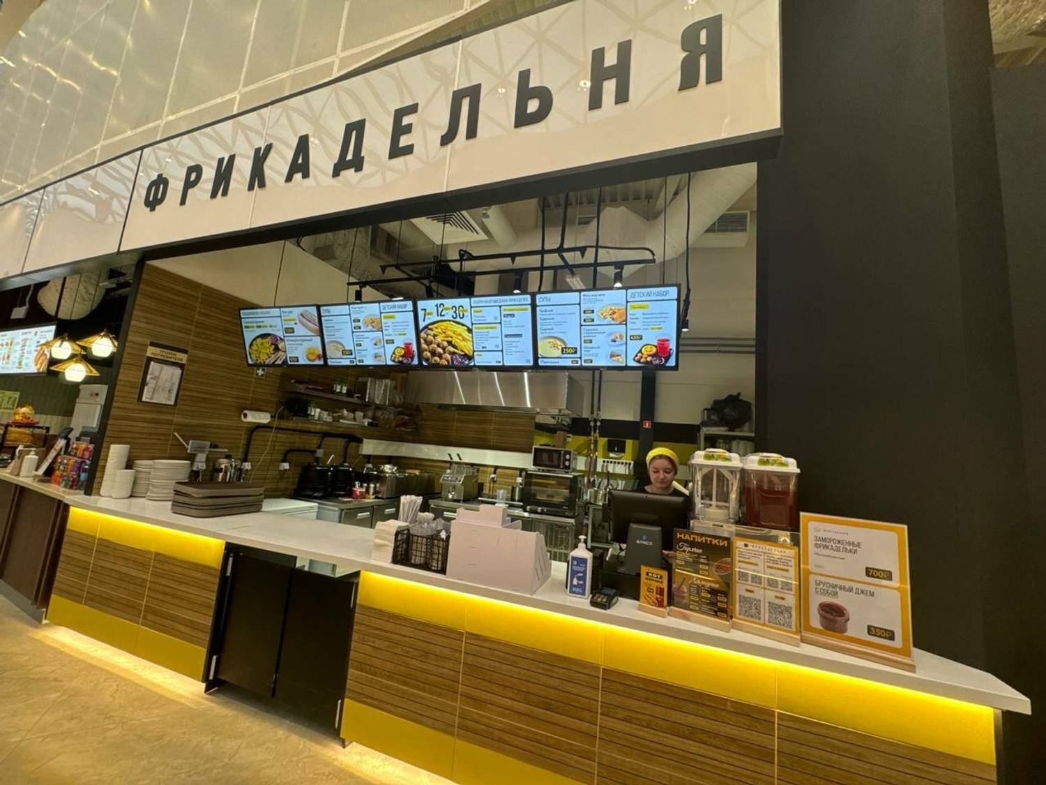 Атмосфера. Пространство выдержано в фирменной черно-желтой палитре, которая создает энергичную и современную атмосферу. Интерьер продуман для максимального удобства: здесь можно быстро сделать заказ, взять еду с собой или расположиться за столиком.