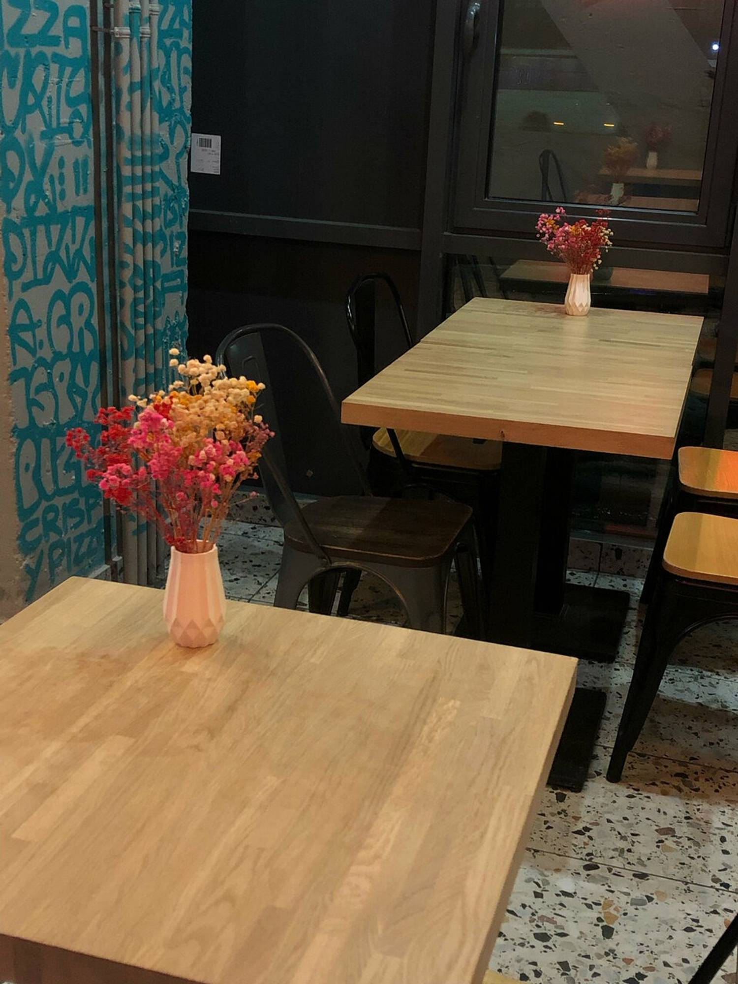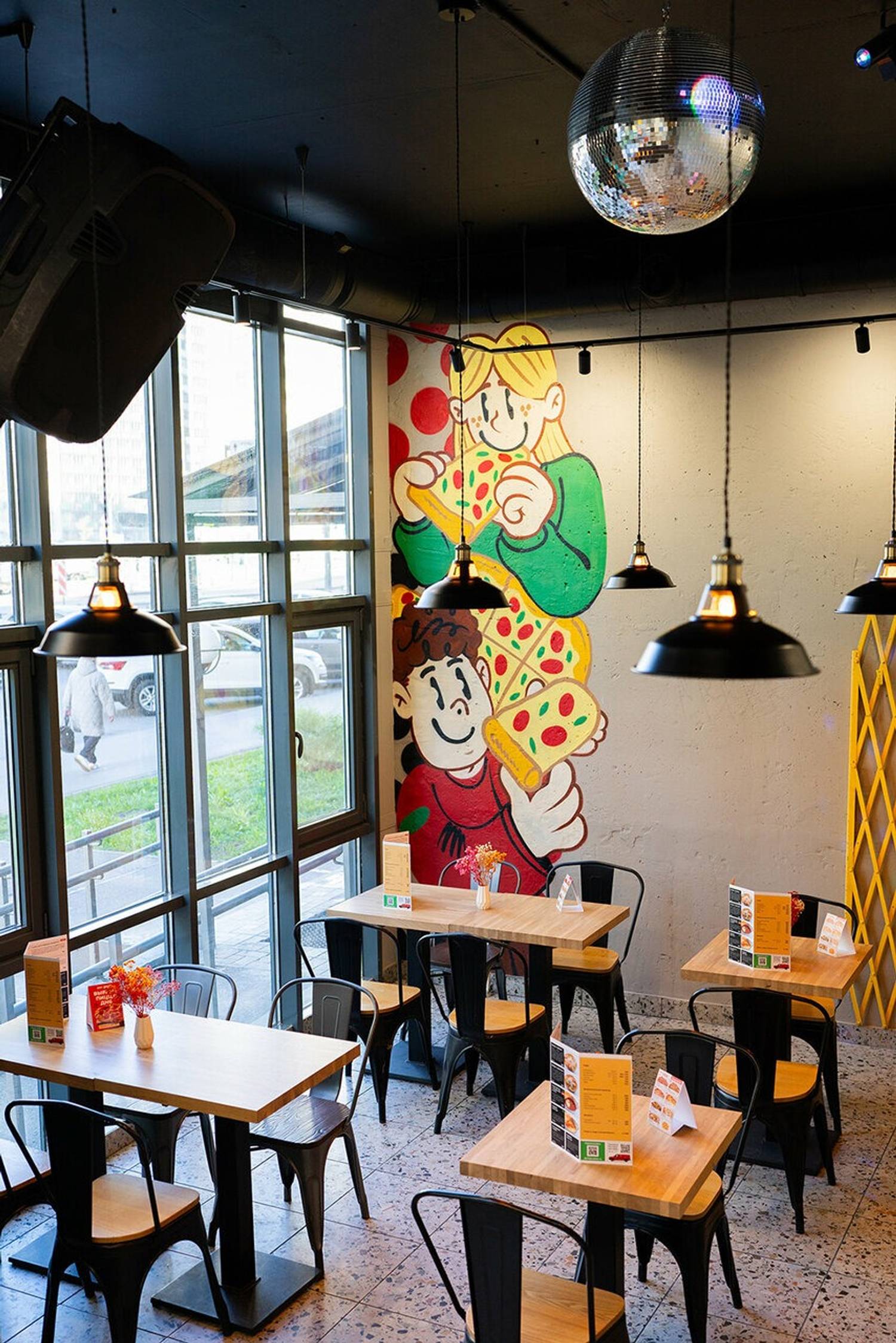 Атмосфера. Рисунки людей в мульти-стиле, которые едят пиццу, каллиграфические надписи, желтые перегородки, деревянные столы. Все вместе создает ощущение драйва и легкости. Это не строгий ресторан, а место, где можно смеяться в голос, пачкать руки в соусе и заказывать еще пиццы.