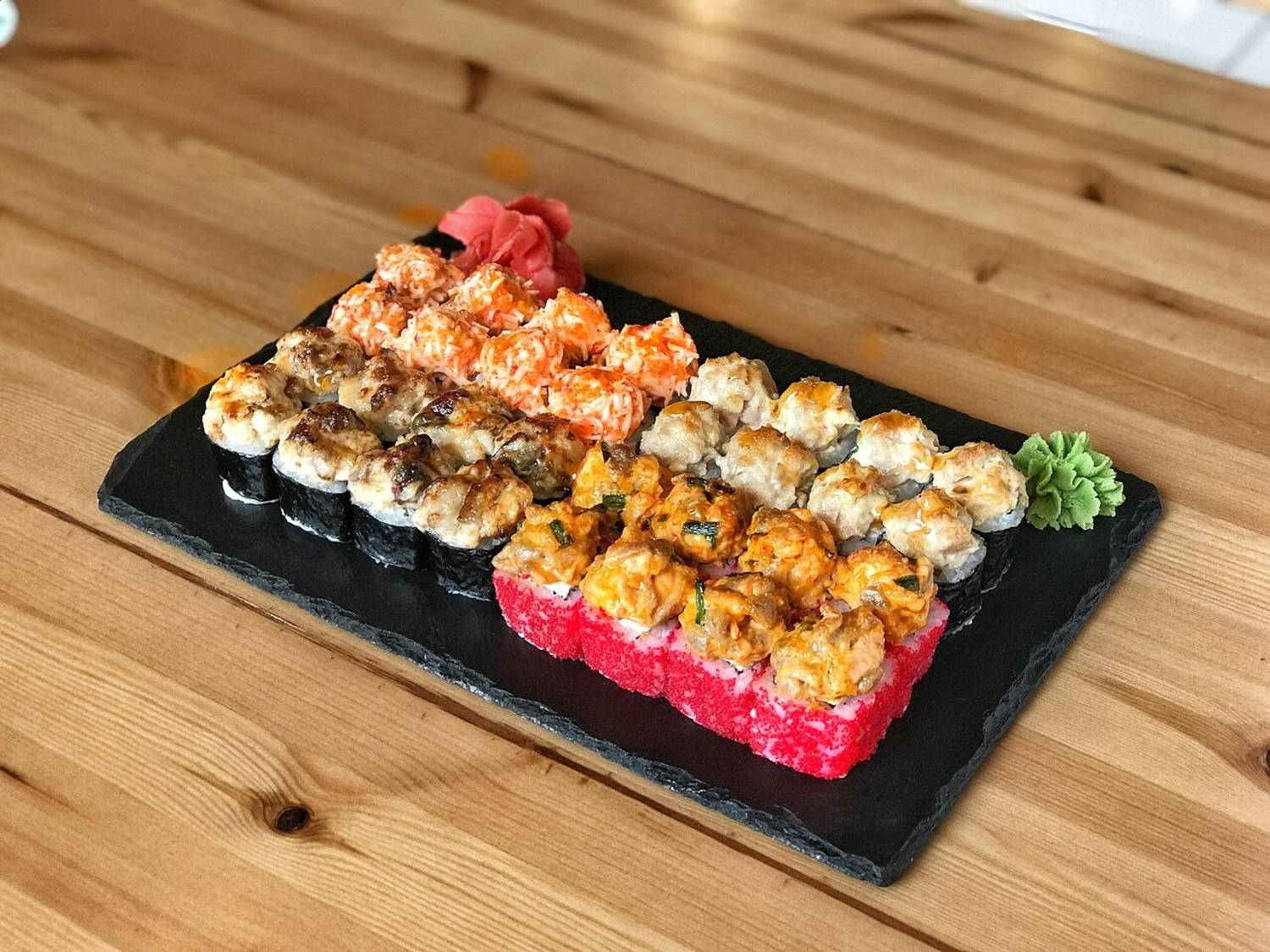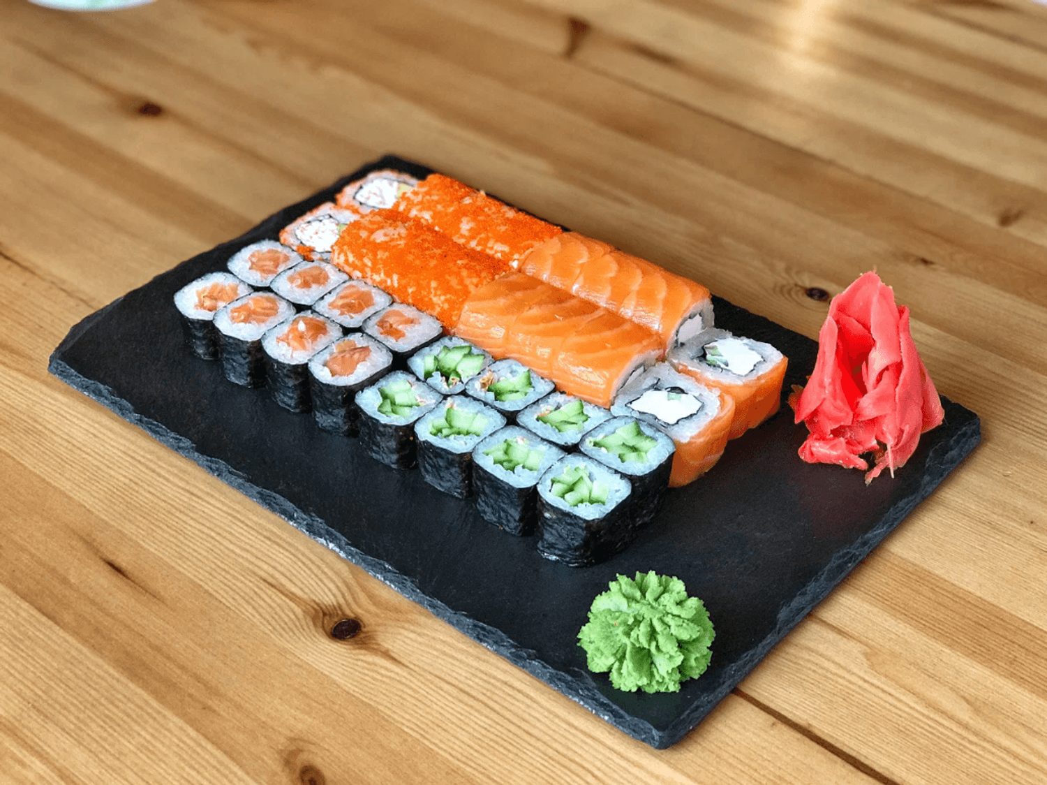 Еда и напитки. В меню — классические роллы с авокадо, креветкой, темпура с угрем и омлетом манго, запеченная калифорния в сырном соусе, гункан с угрем. Также есть поке с крабом, креветкой или тунцом. На горячее есть удон со свининой в соусе сладкий чили, том ям с лососем. К блюдам напитки — зеленый чай, соки или японскую газировку.